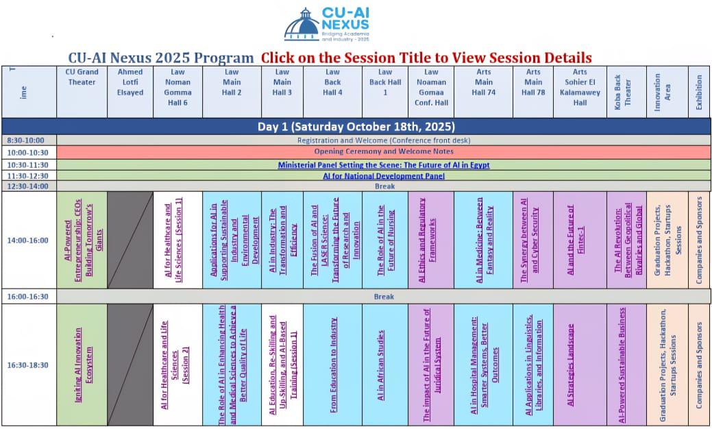 وتبدأ فعاليات اليوم الأول من المؤتمر صباح السبت الموافق 18 من أكتوبر بالتسجيل اعتبارًا من الساعة الثامنة والنصف وحتى الساعة العاشرة صباحًا، ويعقب ذلك الجلسة الافتتاحية الرسمية التي تتضمن كلمات ترحيبية يلقيها رئيس جامعة القاهرة ووزير التعليم العالي والبحث العلمي. وتشهد الفعاليات، عقب الافتتاح، جلسة وزارية رفيعة المستوى بعنوان: "استشراف مستقبل الذكاء الاصطناعي في مصر" تديرها ا.د.هالة السعيد، مستشار رئيس الجمهورية للتنمية الاقتصادية، وبمشاركة ا.د.خالد عبد الغفار، نائب رئيس الوزراء لشئون التنمية البشرية، وا.د.أيمن عاشور وزير التعليم العالي والبحث العلمي، ود. عمرو طلعت وزير الاتصالات وتكنولوجيا المعلومات وم.محمد جبران وزير العمل، تليها جلسة نقاشية ثانية بعنوان "دور الذكاء الاصطناعي في التنمية الوطنية" تديرها ا.د.هبة نصار نائب رئيس جامعة القاهرة الأسبق، بمشاركة نخبة من الخبراء تضم د.أشرف العربي ود.أحمد درويش وم.غادة لبيب ود.أحمد فكري عبد الوهاب وا.إسلام ذكري.