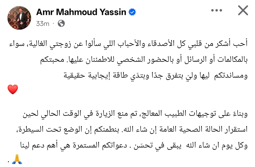وكتب عمرو محمود ياسين من خلال صفحته الرسمية عبر موقع التواصل الاجتماعي فيسبوك، قال: أحب أشكر من قلبي كل الأصدقاء والأحباب اللي سألوا عن زوجتي الغالية، سواء بالمكالمات أو الرسائل أو بالحضور الشخصي للاطمئنان عليها، محبتكم ومساندتكم ليها وليّ بتفرق جدًا وبتدّي طاقة إيجابية حقيقية.