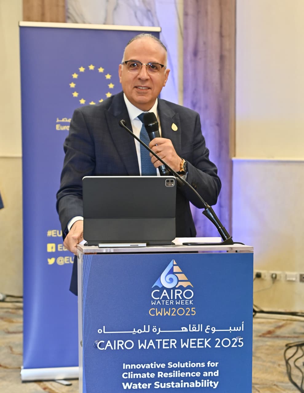 ضمن فعاليات "أسبوع القاهرة الثامن للمياه" .. شهد الأستاذ الدكتور هانى سويلم وزير الموارد المائية والرى، والسفيرة أنجلينا إيخهورست رئيسة بعثة الاتحاد الأوروبي في مصر، فعاليات جلسة "حملة على القد" والتى تضمنت تقييم عدد من الفيديوهات والبوسترات المقدمة من طلبة الجامعات المصرية ضمن مسابقة "حملة على القد"، حيث تنعقد المسابقة بالتعاون بين وزارة الموارد المائية والري والاتحاد الأوروبي .