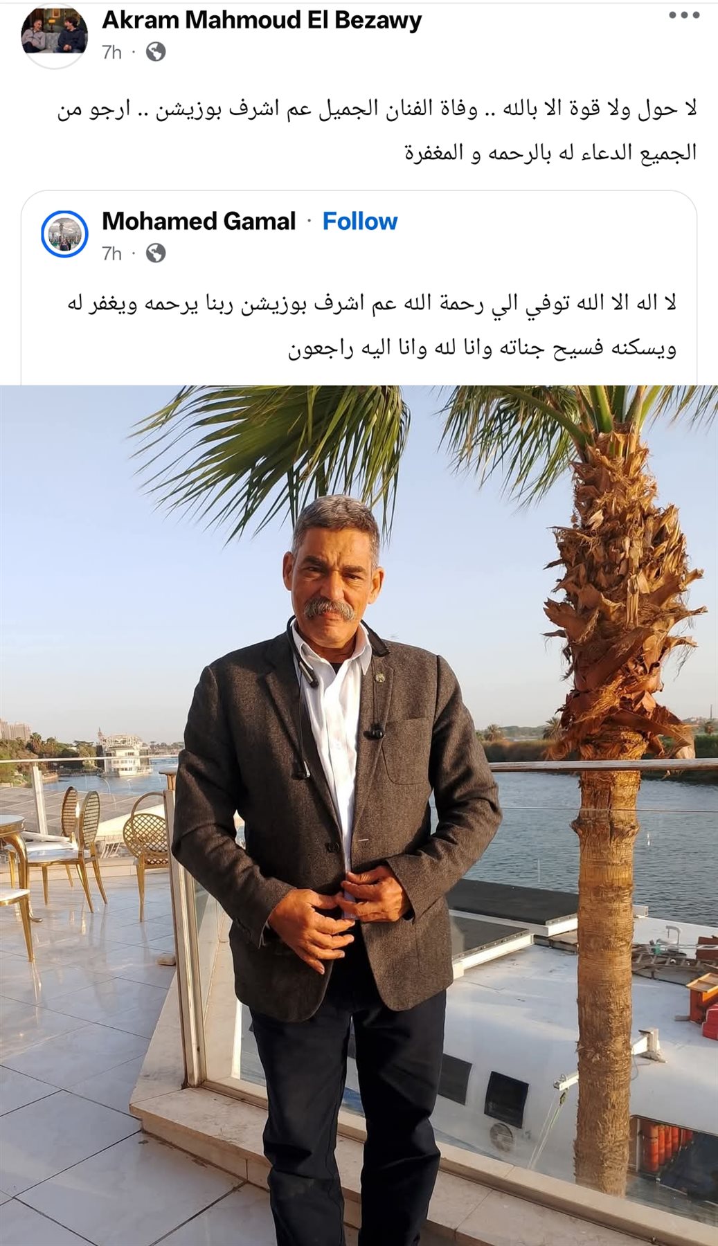 ونشر أكرم صورة له من خلال حسابه الرسمي عبر موقع التواصل الاجتماعي فيسبوك، وكتب: لا حول ولا قوة الا بالله .. وفاة الفنان الجميل عم اشرف بوزيشن .. ارجو من الجميع الدعاء له بالرحمه و المغفرة.
