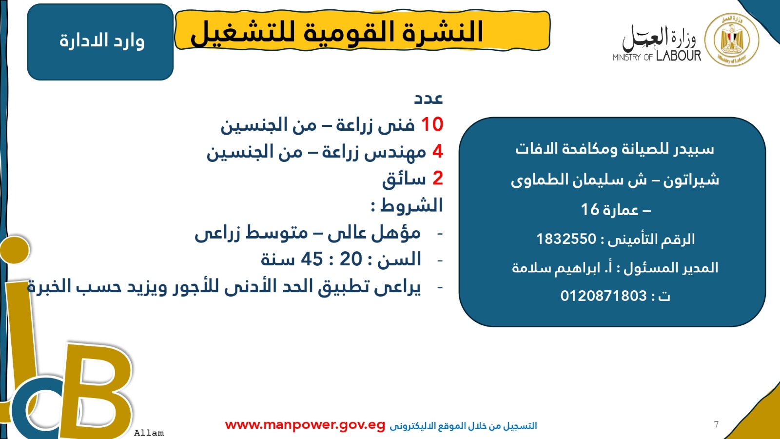 وأكد البيان أن النشرة تتضمن أيضًا مجموعة من الوظائف المخصصة لذوي الهمم في مختلف المحافظات، تنفيذًا لنسبة الـ5% المقررة قانونًا، وبرواتب مجزية، وذلك في إطار خطة الوزارة لحصر وتدريب وتشغيل ذوي الهمم خلال الفترة الحالية، مع إلزام المنشآت بتشغيل النسبة المحددة بموجب القانون رقم 10 لسنة 2018، وتنفيذًا لتوجيهات فخامة الرئيس عبدالفتاح السيسي بدمجهم في سوق العمل.