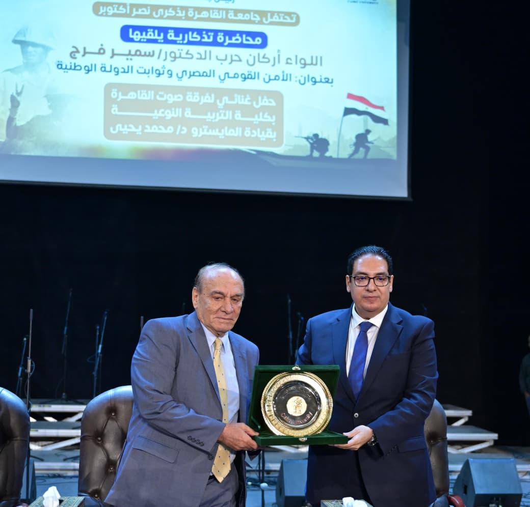 وقد أهدى د. محمد سامي عبدالصادق، درع جامعة القاهرة للواء أركان حرب د.سمير فرج، تقديرًا لجهوده الملموسة في تثقيف شباب الجامعة وتعريفهم بالدروس المستفادة من نصر أكتوبر المجيد والتحديات التي تواجه الامن القومي المصري.