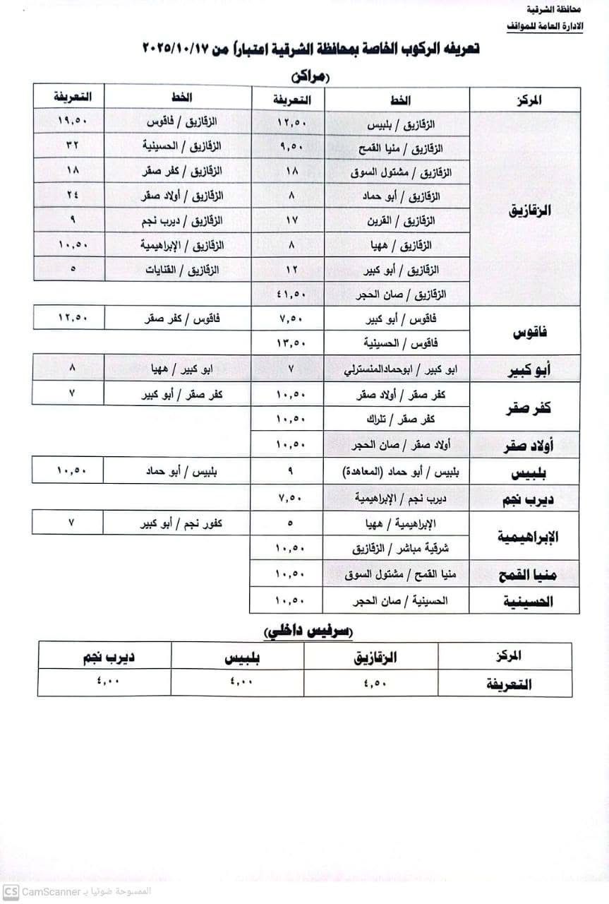 كما أصدر المحافظ قراراً بتعديل تعريفة الركوب لسيارات التاكسي العداد بمدن المحافظة ليكون فتح البنديرة ( 13جنيه ) تشمل كيلو متر واحد على أن تزداد القيمة بواقع (3.5 جنيهات) لكل كيلو متر واحد و( 10 جنيهات ) لساعة الإنتظار الأولى وتزداد بواقع (9.5 جنيه ) لكل ساعة إضافية وكذلك تعديل تسعيرة الركوب لسيارات السرفيس داخل مدينة الزقازيق لتكون 4.5 جنيهات وداخل مدينة بلبيس 4 جنيهات وداخل مدينة ديرب نجم 4 جنيهات .