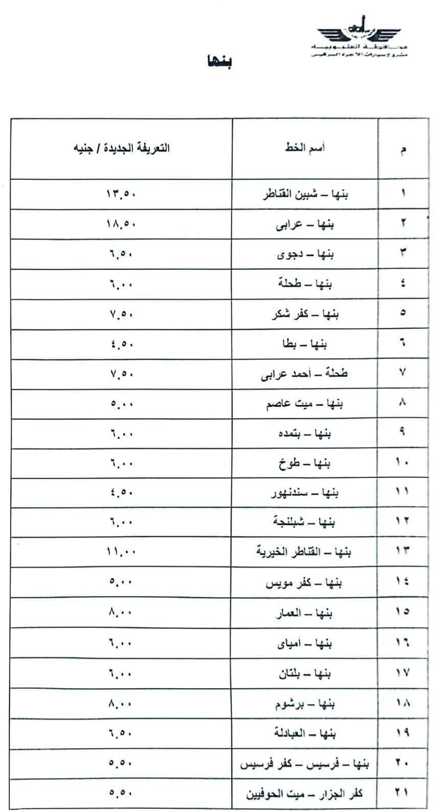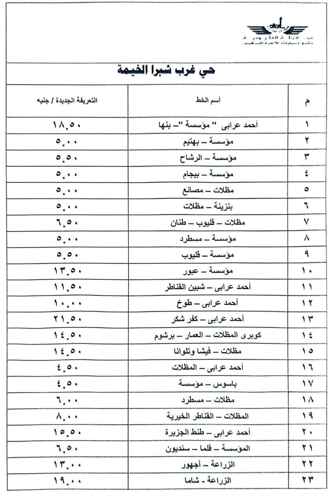 وأصدر المحافظ قراراً بتشكيل لجنة لتعديل التعريفة الجديدة والمقررة لركوب سيارات الأجرة والسرفيس بدائرة المحافظة للخطوط الطويلة والداخلية، لمواكبة الزيادة في أسعار الوقود، والتي شملت: