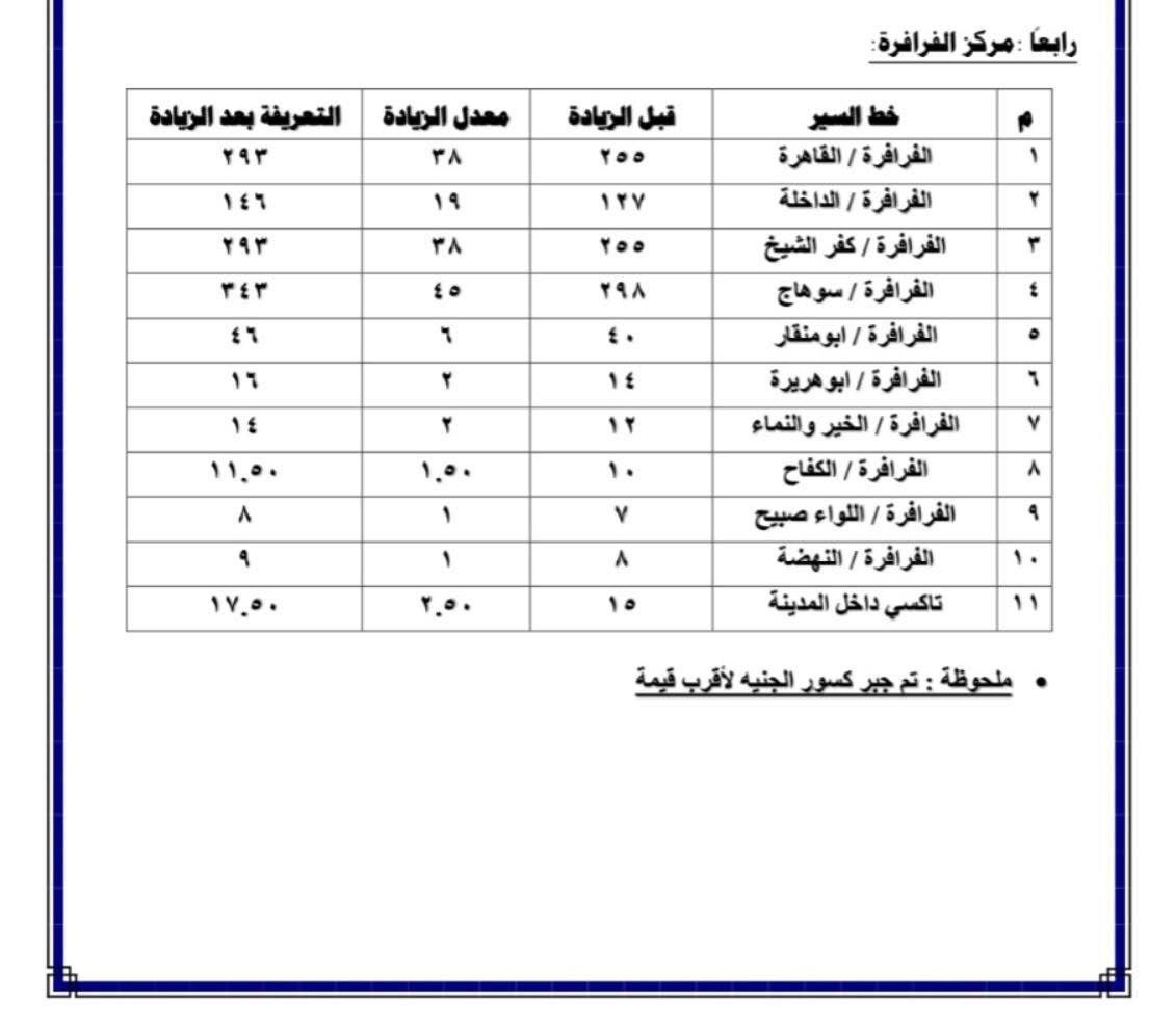 ومن المقرر أن تُعلن المحافظة عن التعريفة الجديدة بشكل رسمي في جميع المواقف، مع التشديد على ضرورة التزام السائقين بها، واتخاذ الإجراءات القانونية ضد أي مخالفات.
