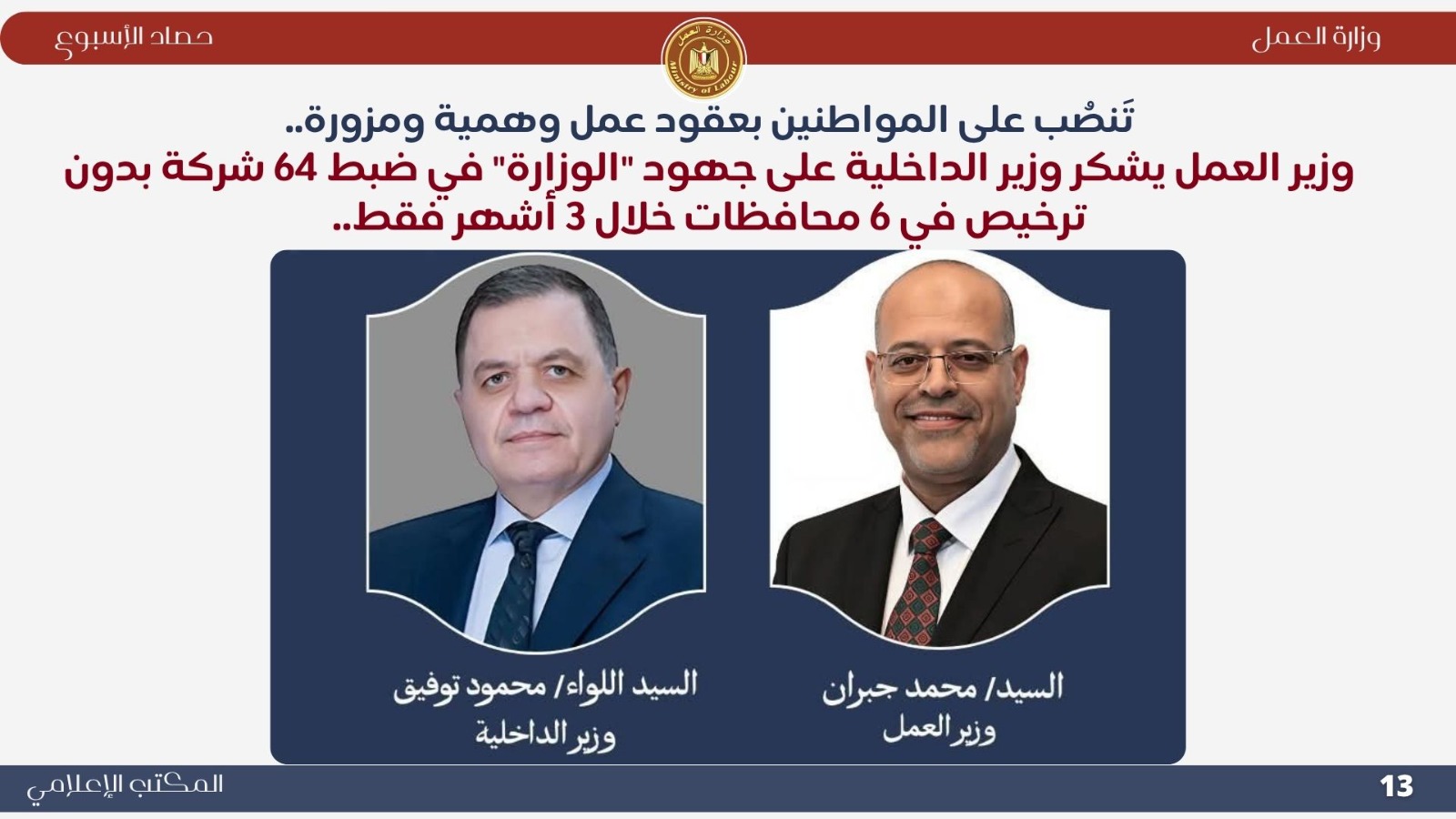 في إطار مواجهة ظاهرة النصب بعقود العمل الوهمية، وجّه الوزير الشكر لوزارة الداخلية على جهودها في ضبط 64 شركة توظيف بدون ترخيص خلال ثلاثة أشهر في 6 محافظات.