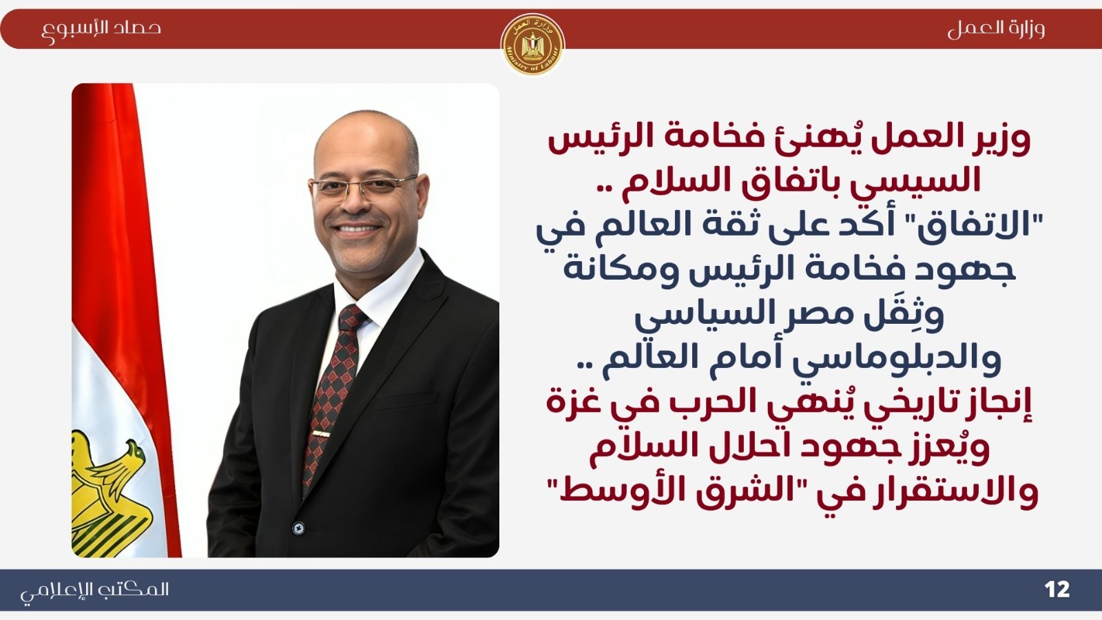 أصدرت وزارة العمل اليوم الجمعة "انفوجراف " يوضح حصاد "الوزارة " خلال أسبوع.. حيث شهدت الوزارة حراكًا واسعًا على مختلف المستويات، يعكس الجهود المستمرة في دعم قضايا العمل، وتعزيز التعاون العربي والدولي، وتطوير بيئة العمل في الداخل بما يواكب توجيهات القيادة السياسية.