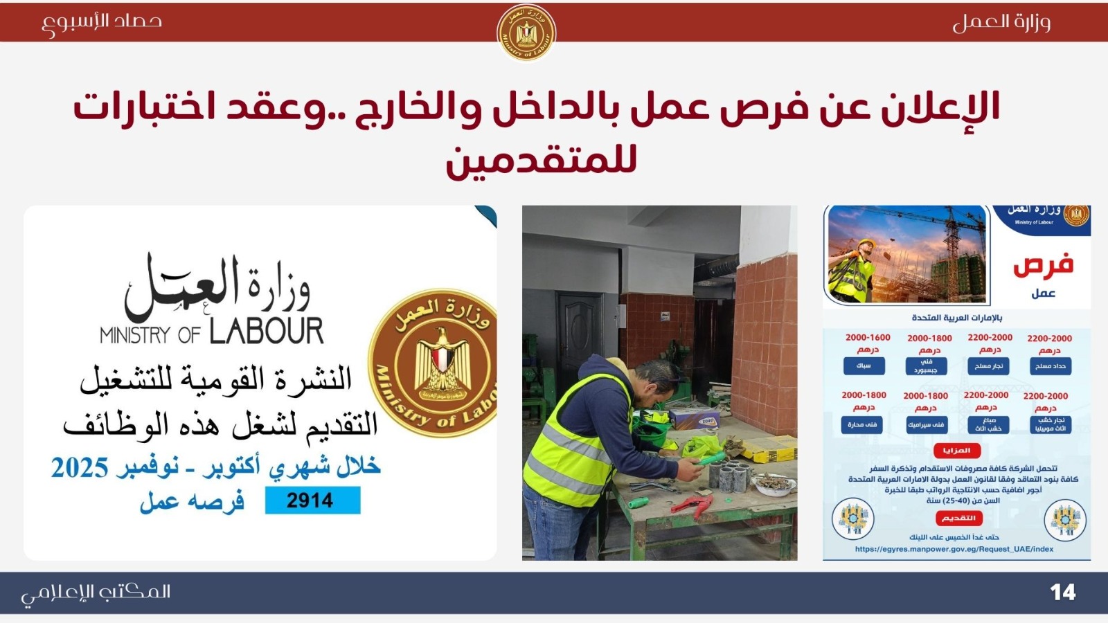 أصدرت وزارة العمل النشرة نصف الشهرية للتوظيف بالتعاون مع القطاع الخاص، متضمنة 2914 فرصة عمل جديدة في 72 شركة بـ13 محافظة، من بينها فرص مخصصة لذوي الهمم تنفيذًا لتوجيهات الرئيس عبد الفتاح السيسي بدمجهم في سوق العمل.