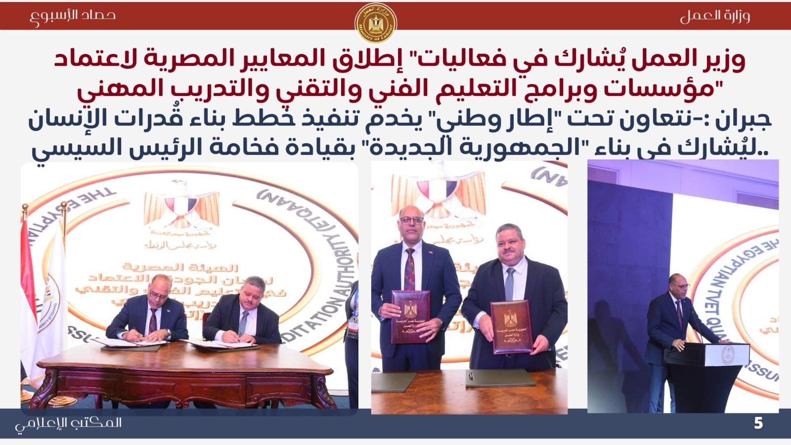 كما شارك في إطلاق المعايير المصرية لاعتماد مؤسسات وبرامج التعليم الفني والتقني والتدريب المهني، مؤكدًا أن هذه الخطوة التاريخية ستسهم في ربط التعليم الفني بسوق العمل وتحسين جودة المخرجات التدريبية.