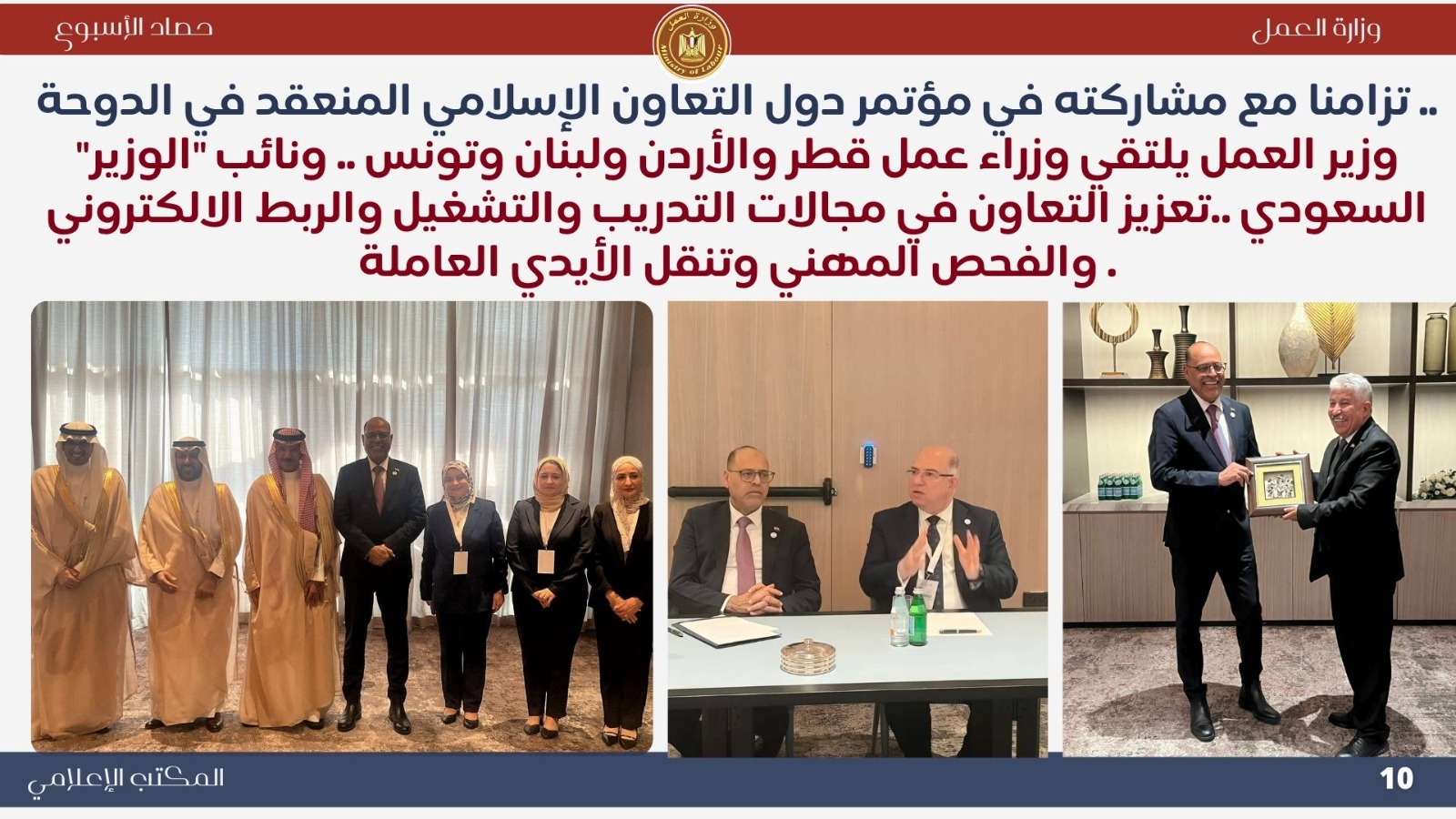 وعقد الوزير محمد جبران لقاءات ثنائية مثمرة مع وزراء عمل السودان وقطر والأردن ولبنان وتونس، ونائب وزير العمل السعودي، لبحث آليات التعاون في مجالات التدريب المهني، والفحص المهني، والربط الإلكتروني للعمالة، وتبادل الخبرات الفنية...كما شارك في المؤتمر الإسلامي السادس لوزراء العمل بالدوحة، مؤكدًا أن مصر تسعى لبناء سوق عمل عصري ومتوازن يحقق العدالة ويحفظ حقوق العمال وأصحاب الأعمال.