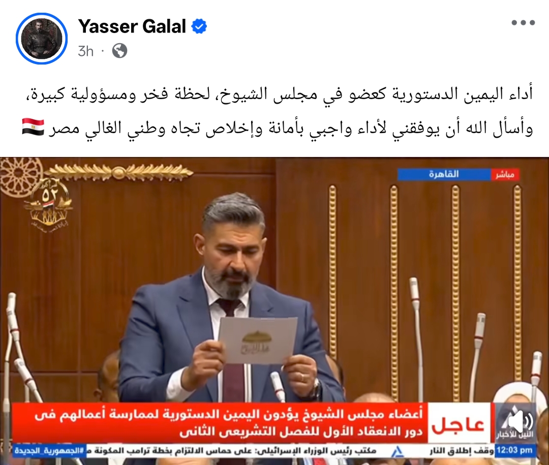 أول تعليق من ياسر جلال بعد أدائه اليمين الدستورية عضوًا بمجلس الشيوخ