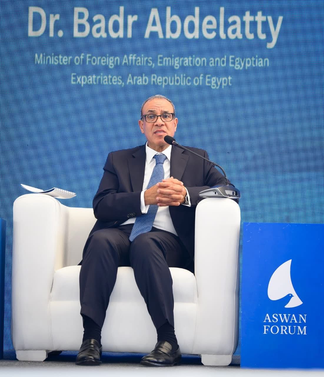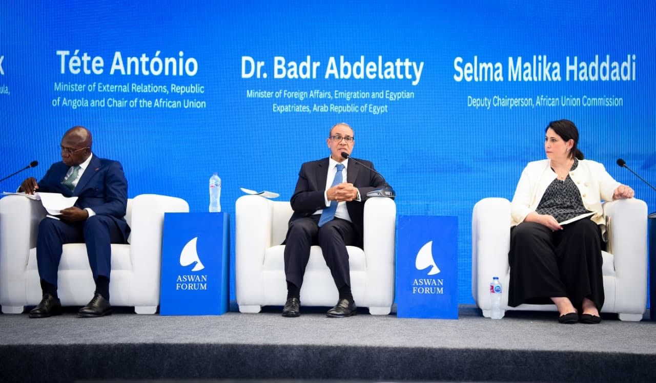 شارك د. بدر عبد العاطي، وزير الخارجية والهجرة وشئون المصريين بالخارج، يوم الأحد ١٩ أكتوبر ٢٠٢٥ كمتحدث رئيسي في الجلسة الافتتاحية لمنتدى أسوان للسلام والتنمية المستدامين تحت عنوان “تخطى مفترق الطرق: استعادة الثقة في النظام الدولي القائم على القواعد”، بجانب كل من السيد تيتي أنطونيو وزير خارجية أنجولا (رئيس الاتحاد الأفريقي)، والسيدة سلمى حدادي نائبة رئيس مفوضية الاتحاد الأفريقي، والسيد بارفيه أونانجا مبعوث الأمم المتحدة للاتحاد الأفريقي، والسيد بانكولي أديوي مفوض الشئون السياسية والسلم والأمن بالاتحاد الأفريقي