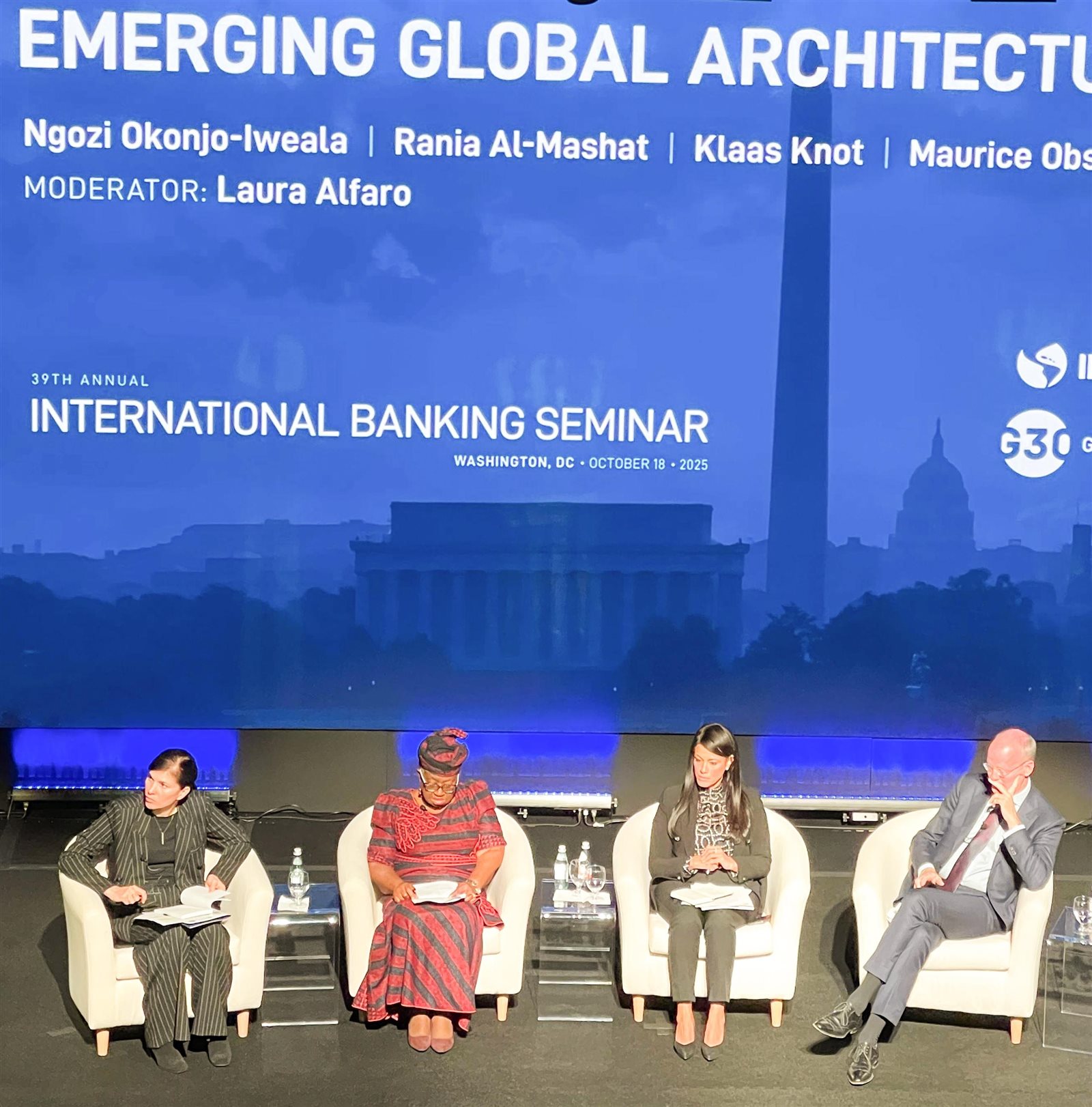 شاركت الدكتورة رانيا المشاط، وزيرة التخطيط والتنمية الاقتصادية والتعاون الدولي، في جلسة نقاشية حول «البنية العالمية الناشئة»، وذلك خلال فعاليات الندوة المصرفية الدولية السنوية الأربعون لمجموعة الثلاثين بواشنطن Group of Thirty، وذلك بحضور كريستالينا جيورجييفا، مديرة صندوق النقد الدولي، والسيدة/ كريستين لاجارد، رئيسة البنك المركزي الأوروبي، والسيدة/ نجوزي أوكونجو إيويالا، المديرة العامة لمنظمة التجارة العالمية، و إيلان جولدفاجن، رئيس بنك التنمية للبلدان الأمريكية.
