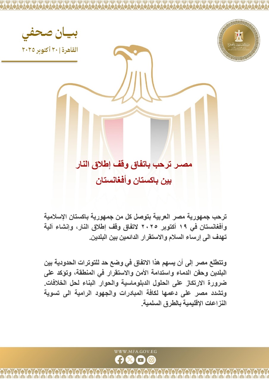 ترحب جمهورية مصر العربية بتوصل كل من جمهورية باكستان الإسلامية وأفغانستان في ۱۹ أكتوبر ۲۰۲۰ لاتفاق وقف إطلاق النار، وإنشاء آلية تهدف الى إرساء السلام والاستقرار الدائمين بين البلدين.
