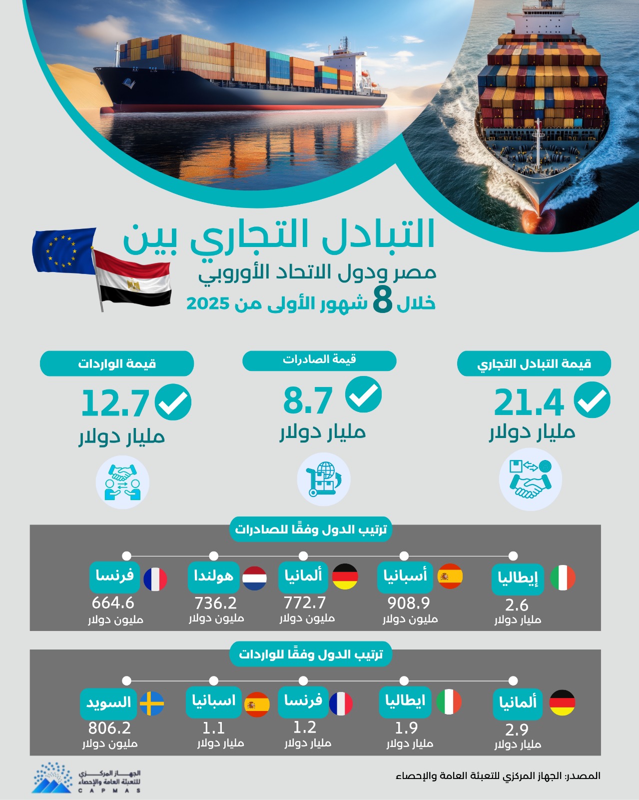 وتزامنًا مع انطلاق القمة المصرية الأوروبية الأولى أصدر الجهاز المركزى للتعبئة العامة والإحصاء بيانًا صحفيًا يتضمن العلاقات الاقتصادية بين مصر ودول الاتحاد الأوروبى ، حيث أظهرت بيانات الجهاز اليوم الأربعاء الموافق 22 / 10 / 2025 عن وصول قيمة الصادرات المصرية إلى دول الاتحاد الأوربى 8.7 مليار دولار من يناير حتى أغسطس 2025 مقابل 8.1 مليار دولار خلال نفس الفترة من عام 2024 بنسبة ارتفاع قدرها 7.4 %