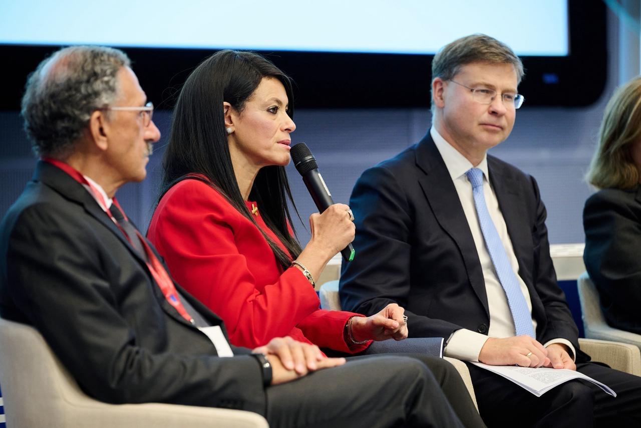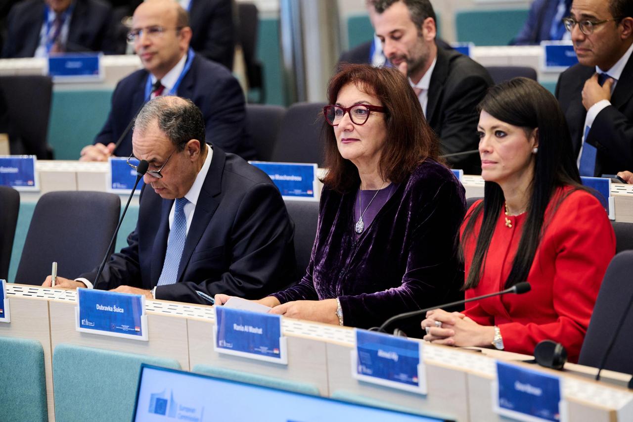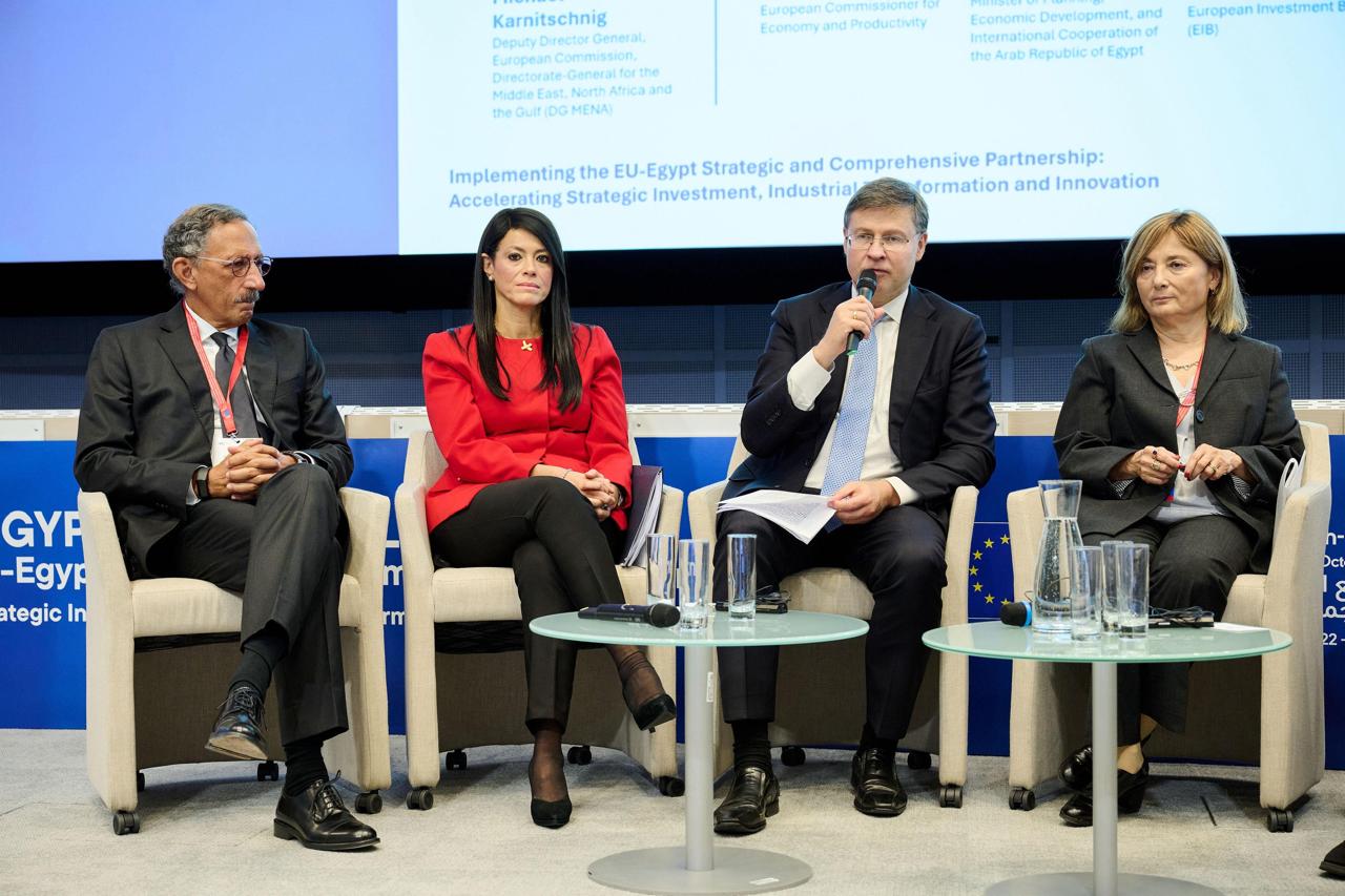 شارك في الجلسة السيد/ فالديس دومبروفسكيس، المفوض الأوروبي للاقتصاد والإنتاجية، والسيدة/ جيلسومينا فيليوتي، نائب رئيس البنك الأوروبي للاستثمار (EIB)، والسيد/ طارق توفيق، رئيس اتحاد منظمات الأعمال المتوسطية (Business MED)، والسيد/ لابو بيستيلي، مدير الشؤون العامة بشركة إيني (ENI).