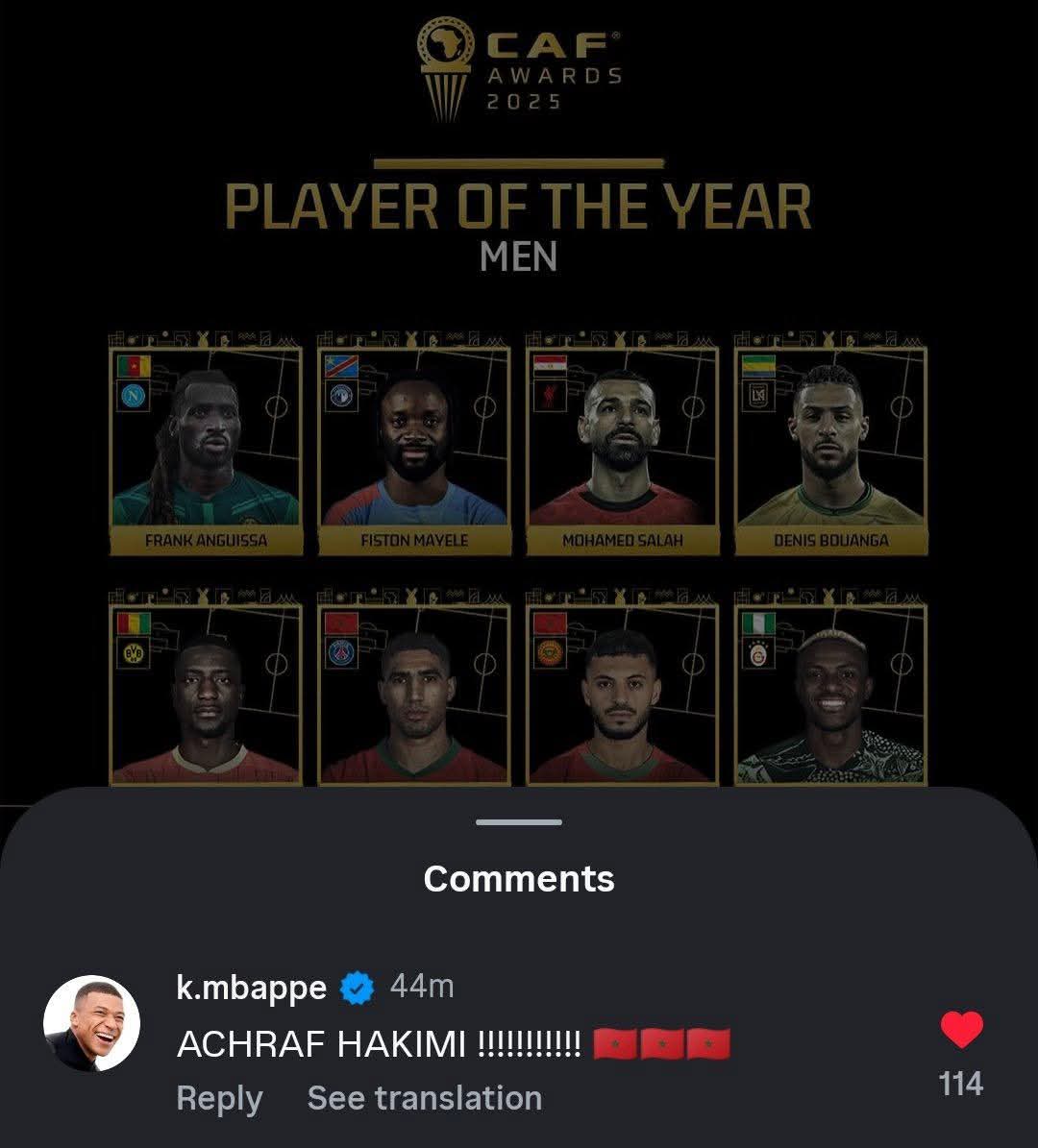 وعلق مبابي على الصورة الرسمية التي تجمع المرشحين لجائزة أفضل لاعب في أفريقيا 2025 وكتب عليها: ashraf hakimi وبجانبها قلوب.