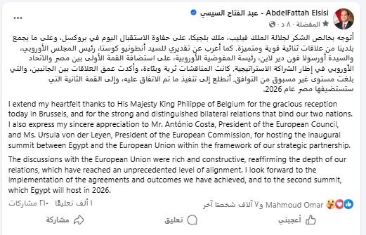 وأكد عمق العلاقات بين الجانبين، والتى بلغت مستوى غير مسبوق من التوافق. أتطلع إلى تنفيذ ما تم الاتفاق عليه، وإلى القمة الثانية التى ستستضيفها مصر عام 2026".