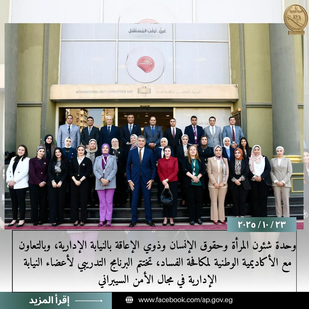 اختتمت وحدة شئون المرأة وحقوق الإنسان وذوي الإعاقة برئاسة المستشارة بريهان محسن، وبالتعاون مع الأكاديمية الوطنية لمكافحة الفساد تحت قيادة الوكيل هشام الركايبي - مدير الأكاديمية، اليوم الخميس الموافق ٢٢ / ١٠ / ٢٠٢٥، البرنامج التدريبي لأعضاء النيابة الإدارية في مجال الأمن السيبراني، والذي عُقدَ على مداري يومي ٢١ ، ٢٢ أكتوبر الجاري، بمقر الأكاديمية الوطنية لمكافحة الفساد، بمشاركة "٣١" من السيدات والسادة مستشاري النيابة الإداري؛ تنفيذاً لتوجيهات معالي المستشار محمد الشناوي - رئيس هيئة النيابة الإدارية.