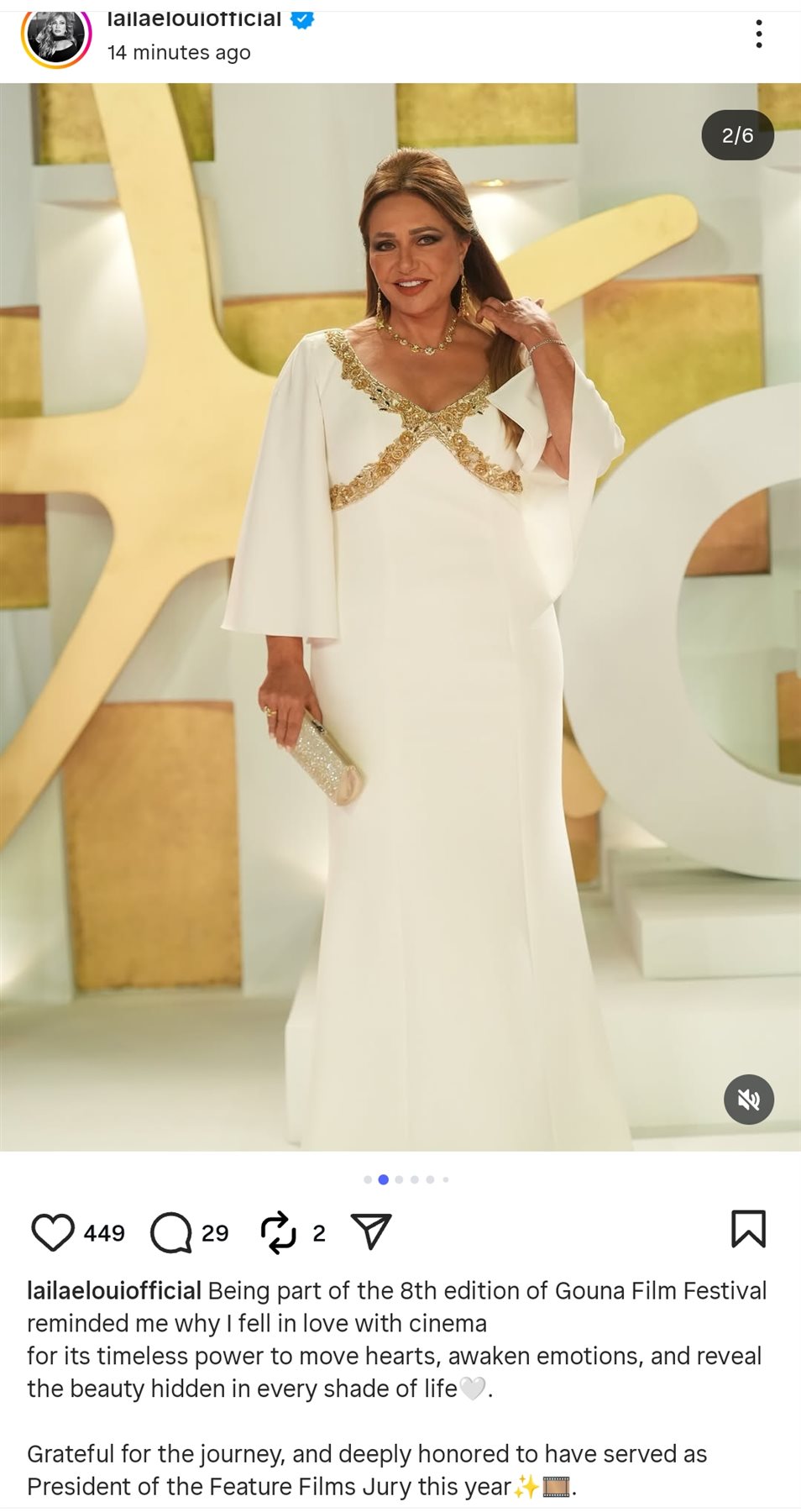 شاركت ليلى علوي جمهورها صور لها عبر حسابها الرسمي على موقع تبادل الصور والفيديوهات القصيرة "إنستجرام"، حيث أطلت بفستان طويل ملكي من اللون الأبيض، مع مكياج ناعم أبرز ملامحها الطبيعية، كما تركت شعرها منسدلًا على كتفيها، ما منحها مظهرًا أنيقًا ولافتًا.