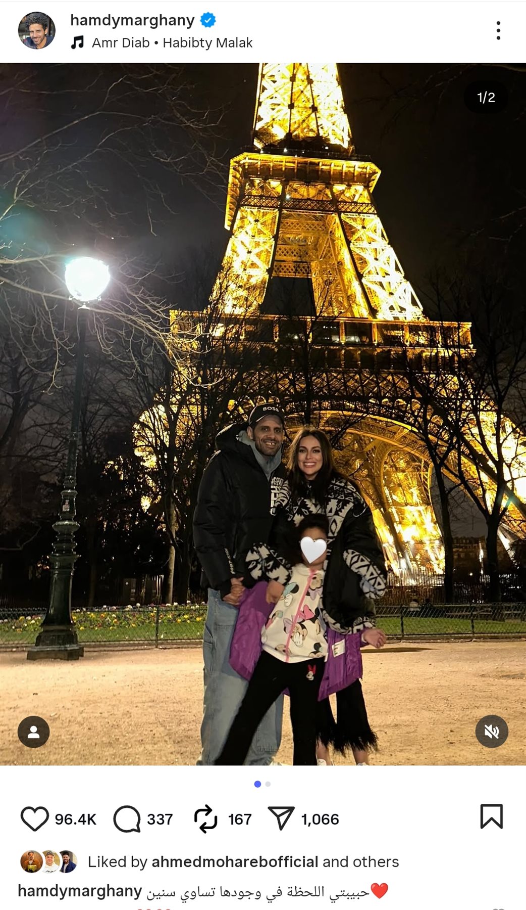 وشارك حمدي الميرغني جمهوره صور تجمعه بعائلته أثناء قضاء أجازتهم في باريس بأجواء مليئة بالحب والدفء، وذلك من خلال حسابه الرسمي عبر موقع تبادل الصور والفيديوهات القصيرة إنستجرام، وكتب: حبيبتي اللحظة في وجودها تساوي سنين.