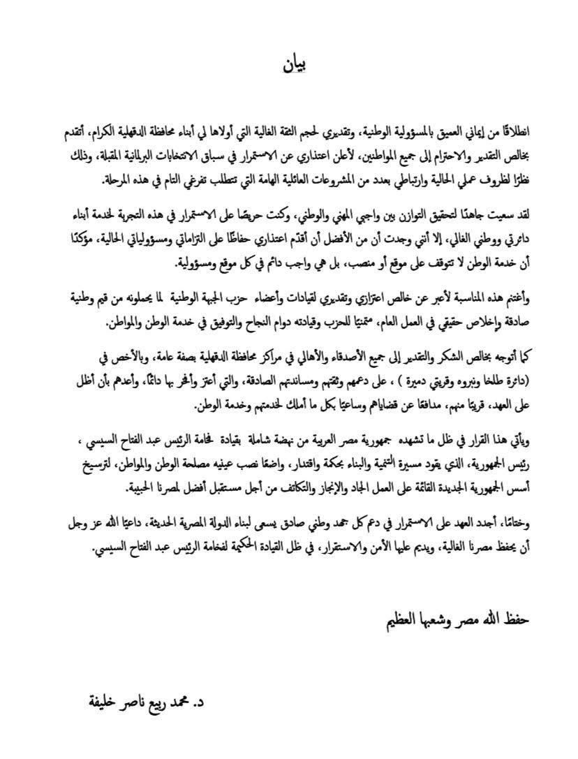 وقال فى نص بيان اعتذاره،" انطلاقًا من إيماني العميق بالمسؤولية الوطنية، وتقديري لحجم الثقة الغالية التي أولاها لي أبناء محافظة الدقهلية الكرام، أتقدم بخالص التقدير والاحترام إلى جميع المواطنين، لأعلن اعتذاري عن الاستمرار في سباق الانتخابات البرلمانية المقبلة، وذلك نظرًا لظروف عملي الحالية وارتباطي بعدد من المشروعات العائلية الهامة التي تتطلب تفرغي التام في هذه المرحلة".