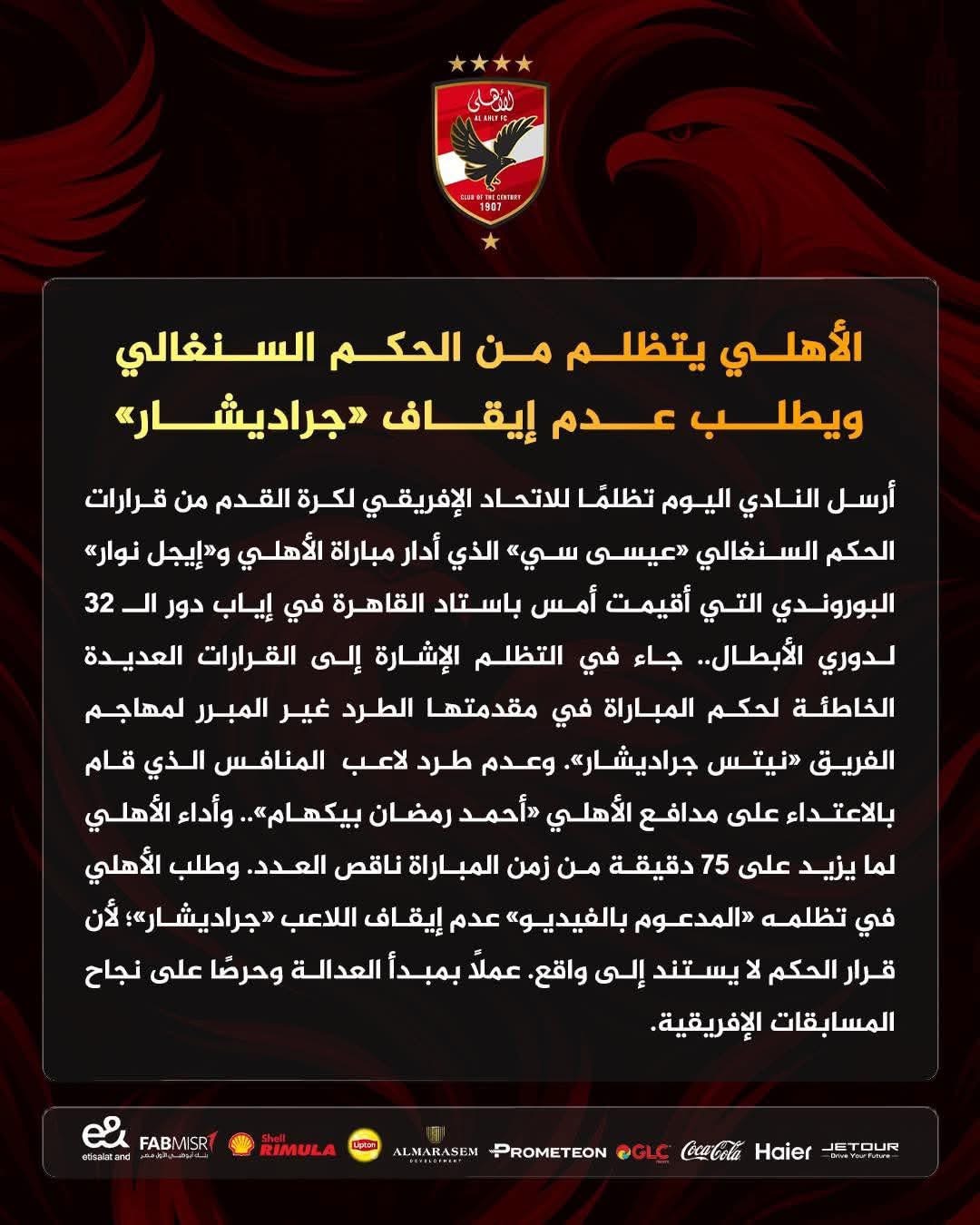 وأوضح النادي في بيانه الرسمي، أن التظلم جاء اعتراضًا على الأداء التحكيمي للحكم السنغالي عيسى سي، الذي ارتكب وفق ما جاء في المذكرة عددًا من الأخطاء المؤثرة على مجريات اللقاء.