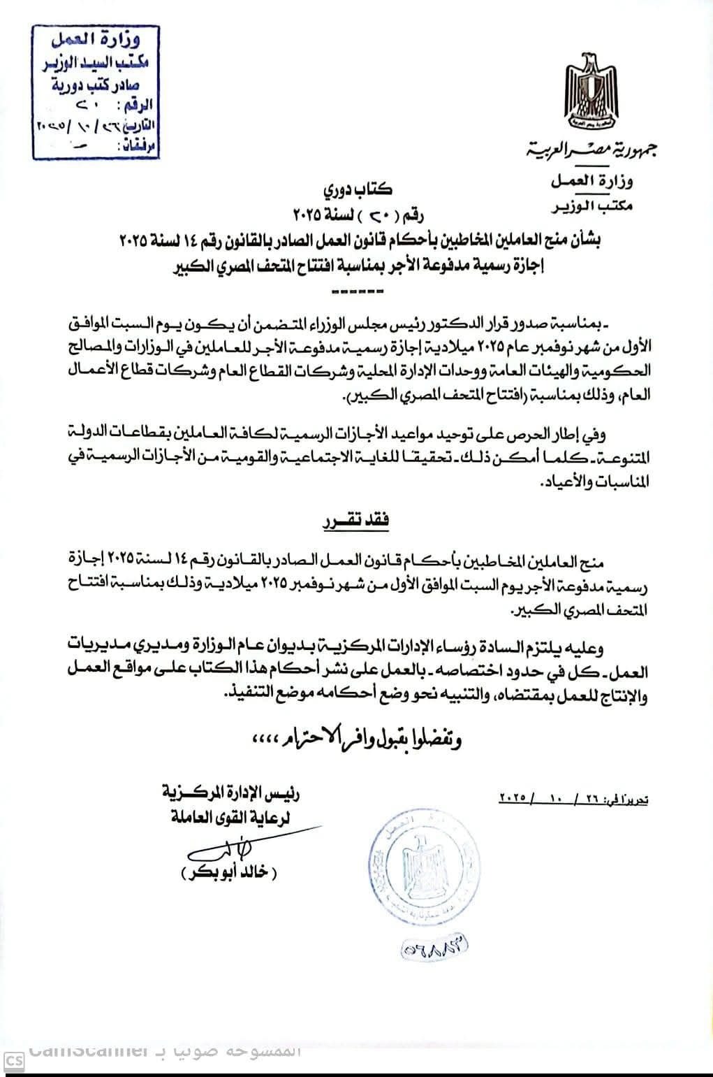 أعلن وزير العمل محمد جبران، أن يوم السبت المقبل الموافق 1 نوفمبر 2025 سيكون إجازة رسمية مدفوعة الأجر للعاملين بالقطاع الخاص الخاضعين لأحكام قانون العمل الصادر بالقانون رقم 14 لسنة 2025، وذلك بمناسبة افتتاح المتحف المصري الكبير.
