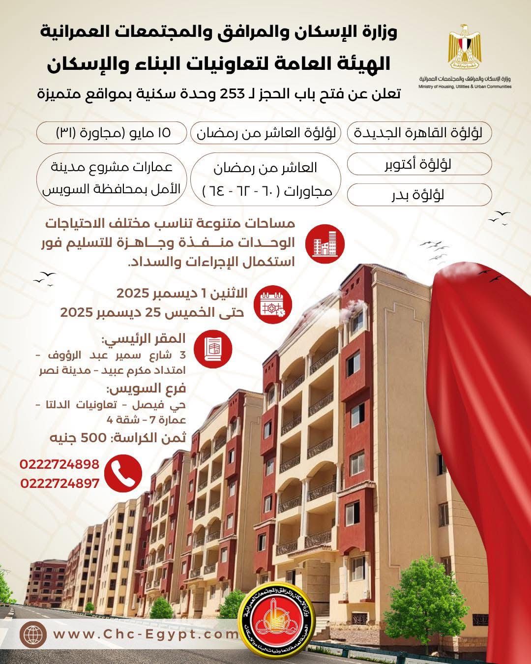 أعلنت الهيئة العامة لتعاونيات البناء والإسكان، إحدى جهات وزارة الإسكان والمرافق والمجتمعات العمرانية، عن فتح باب الحجز لـ ٢٥٣ وحدة سكنية بمواقع متميزة بمشروعات الهيئة: لؤلؤة القاهرة الجديدة - لؤلؤة أكتوبر - لؤلؤة بدر - لؤلؤة العاشر من رمضان - العاشر من رمضان مجاورات (60 - 62 - 64) ، وفى ١٥ مايو مجاورة "۳۱" ، و بمحافظة السويس (عمارات مشروع مدينة الأمل) ، وذلك بمساحات مختلفة.