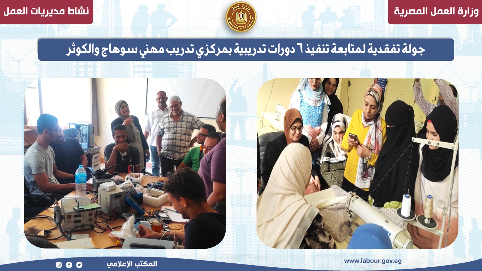 نفذت مديرية العمل بسوهاج جولة تفقدية لمتابعة تنفيذ عدد من الدورات التدريبية بمركزي تدريب مهني سوهاج والكوثر ضمن خطة التدريب المهني التي تنفذها المديرية لتأهيل الشباب وتنمية مهاراتهم على المهن المطلوبة في سوق العمل.