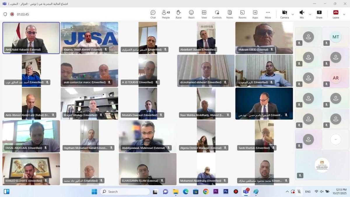 عقد السفير نبيل حبشي نائب وزير الخارجية والهجرة وشئون المصريين بالخارج لقاءً افتراضياً مع أبناء الجالية المصرية في كل من المغرب وتونس والجزائر يوم الأثنين الموافق ٢٧ أكتوبر ٢٠٢٥، وذلك بمشاركة كل من السفير أحمد نهاد عبد اللطيف سفير جمهورية مصر العربية في المغرب، والسفير باسم حسن سفير جمهورية مصر العربية في تونس، والسفير عبد اللطيف اللايح سفير جمهورية مصر العربية في الجزائر.