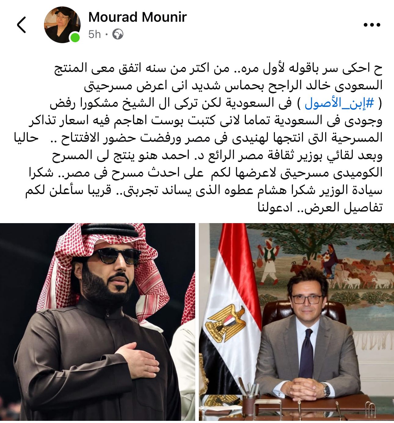 وقال منير في منشور عبر حسابه الرسمي على موقع التواصل الاجتماعي "فيسبوك": من أكتر من سنة اتفقت مع المنتج السعودي خالد الراجح بحماس شديد إني أعرِض مسرحيتي ابن الأصول في السعودية، لكن آل الشيخ مشكورًا رفض وجودي في السعودية تمامًا لأني كنت كتبت بوست هاجمت فيه أسعار تذاكر المسرحية اللي انتهت لهند صبري ورفضت حضور الافتتاح.