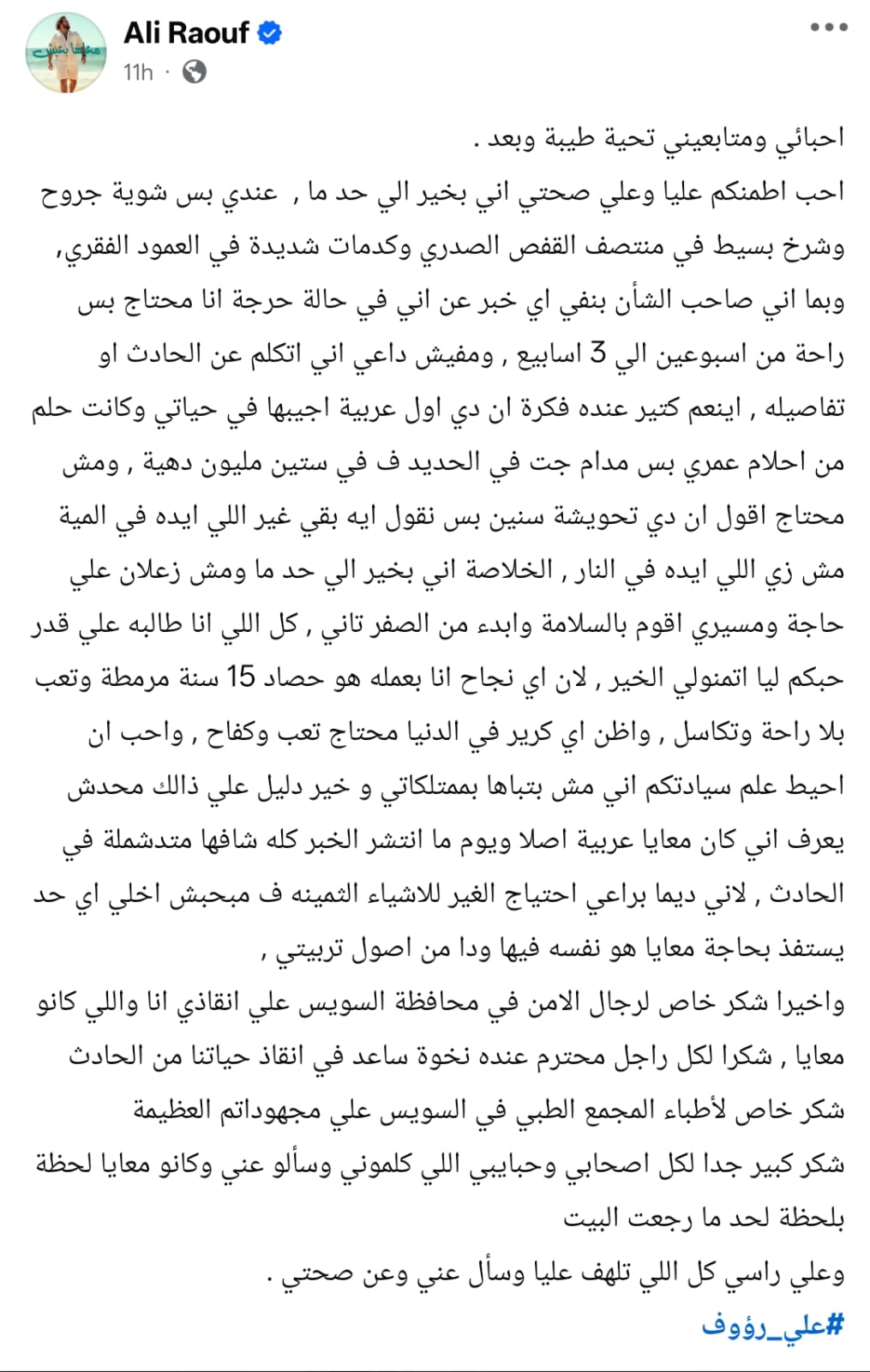 أحب أطمنكم عليا وعلي صحتي إني بخير إلى حد ما، عندي بس شوية جروح وشرخ بسيط في منتصف القفص الصدري وكدمات شديدة في العمود الفقري، وبما إني صاحب الشأن بنفي أي خبر عن إني في حالة حرجة أنا محتاج بس راحة من اسبوعين الي 3 اسابيع، ومفيش داعي إني أتكلم عن الحادث أو تفاصيله.