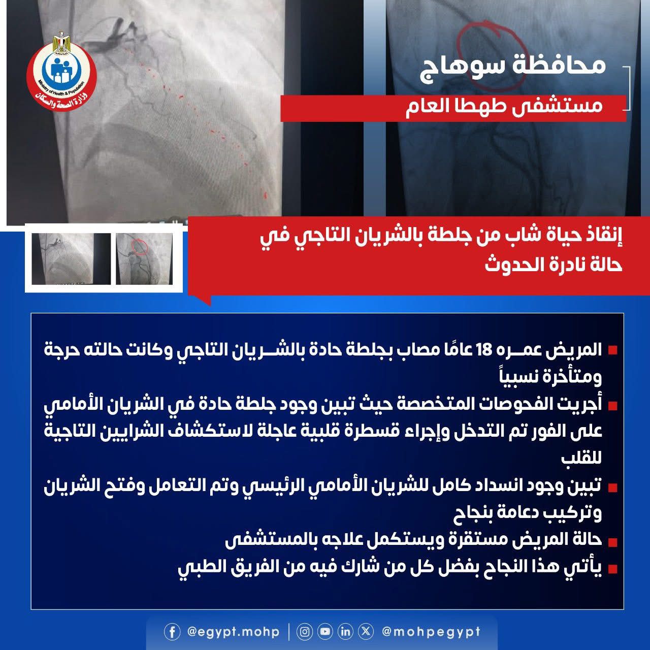 وصل المريض إلى مستشفى طهطا العام في محافظة سوهاج في حالة حرجة ومتأخرة نسبيًا، وعلى الفور جرى تشكيل فريق طبي متكامل، حيث تم إجراء الفحوصات القلبية المتخصصة التي أظهرت وجود انسداد كامل في الشريان الأمامي الرئيسي للقلب.
