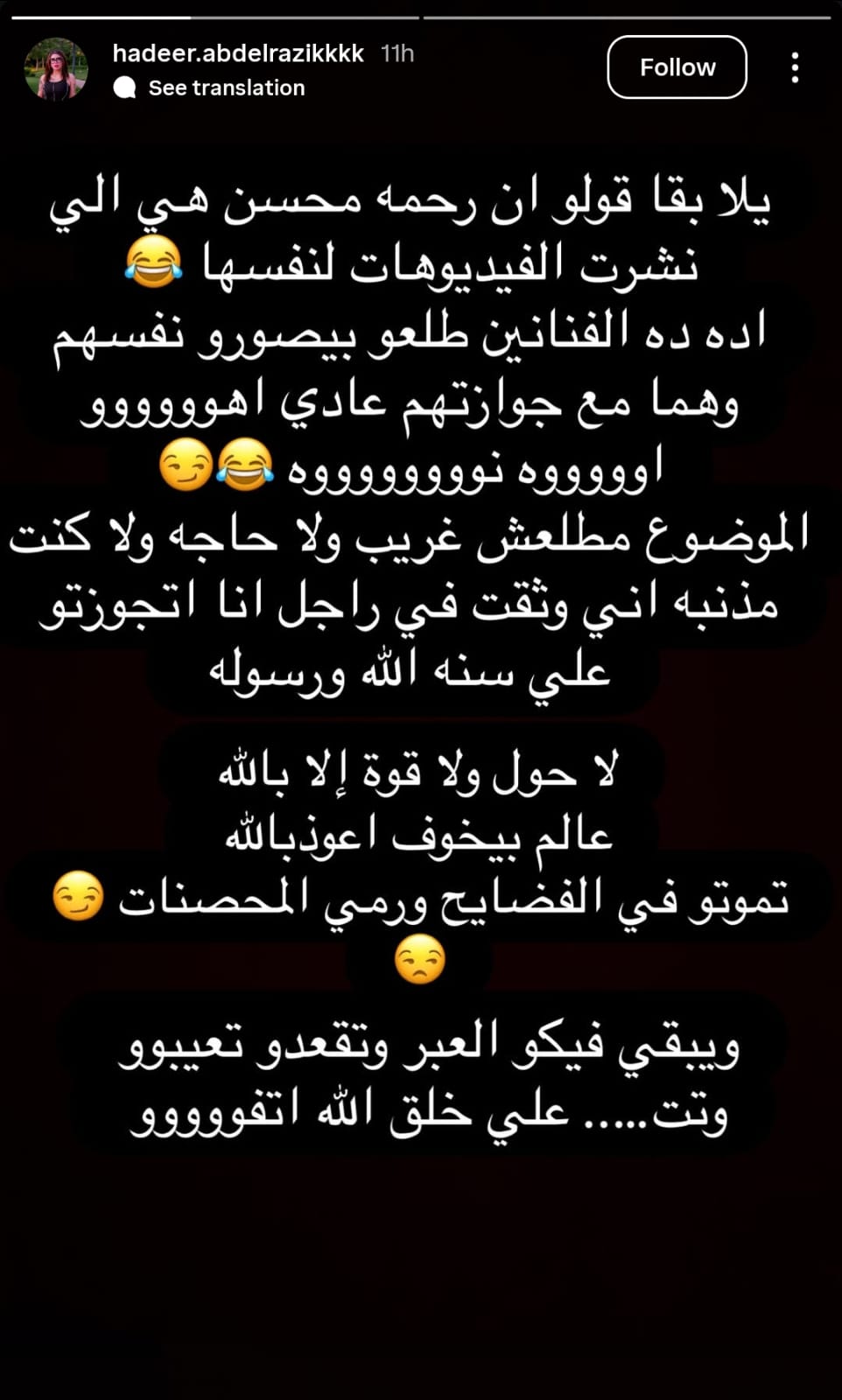 وكتبت هدير عبد الرازق من خلال حسابها الرسمي عبر موقع تبادل الصور والفيديوهات القصيرة إنستجرام، عبر خاصية ستوري، قالت فيه: يلا بقا قولو ان رحمه محسن هي الي نشرت الفيديوهات لنفسها ، اده ده الفنانين طلعو بيصورو نفسهم وهما مع جوازتهم عادي اهوووووو.