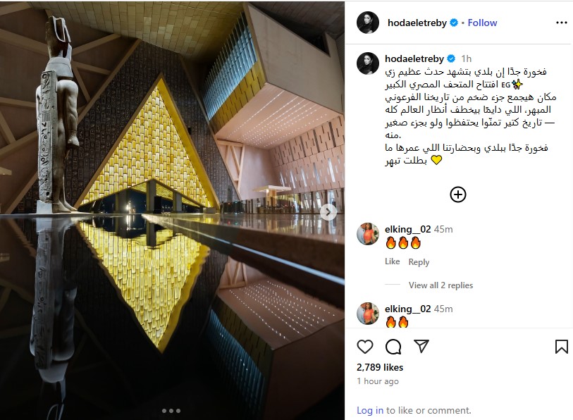 وكتبت هدى الأتربي من خلال حسابها الرسمي عبر موقع تبادل الصور والفيديوهات القصيرة إنستجرام: فخورة جدًا إن بلدي بتشهد حدث عظيم زي افتتاح المتحف المصري الكبير.. مكان هيجمع جزء ضخم من تاريخنا الفرعوني المبهر، اللي دايمًا بيخطف أنظار العالم كله — تاريخ كتير تمنّوا يحتفظوا ولو بجزء صغير منه.