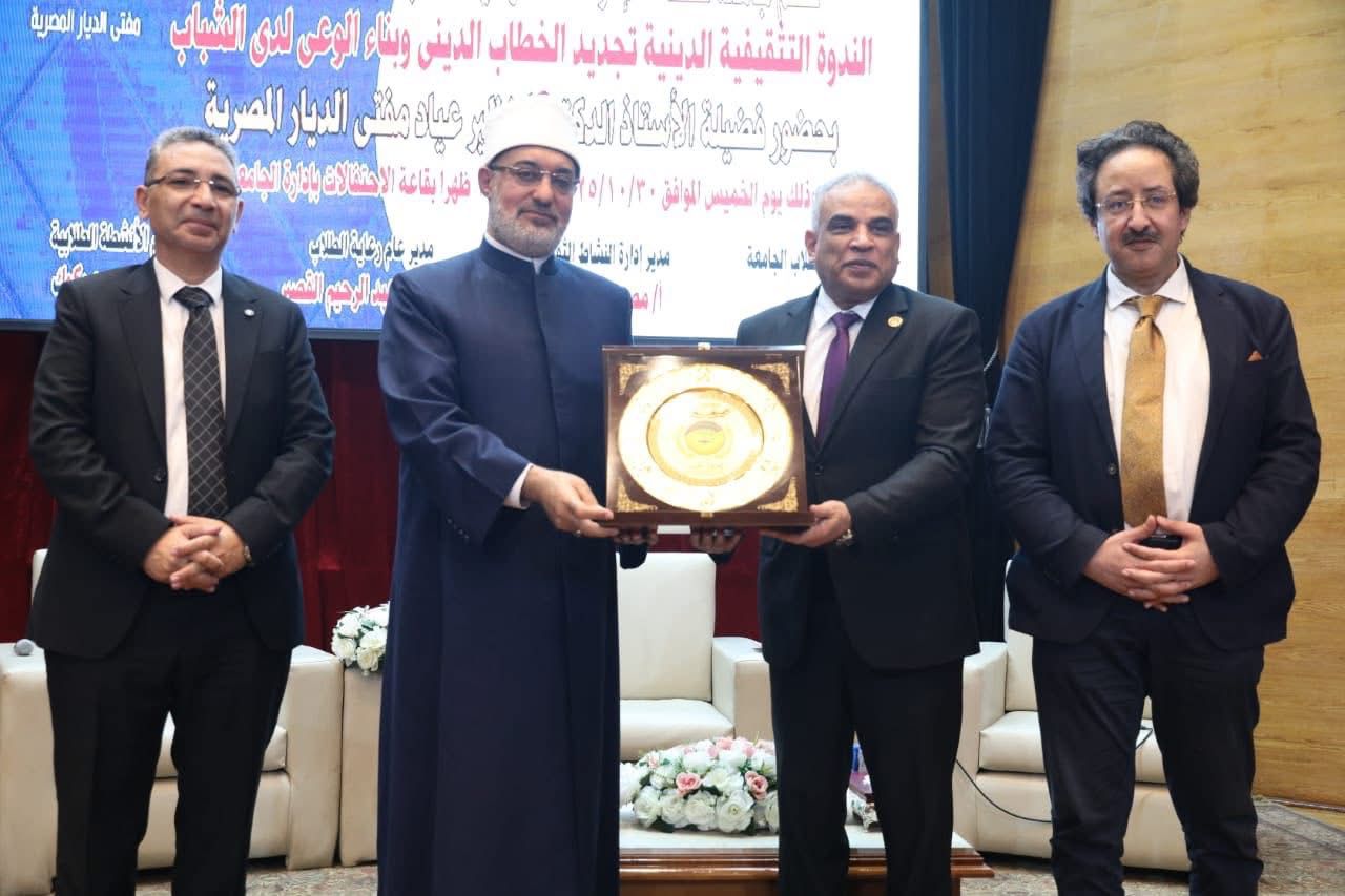وفي لفتة تقدير قام الأستاذ الدكتور محمد حسين رئيس جامعة طنطا بتقديم درع الجامعة لفضيلة المفتي، تقديرًا لجهوده البارزة في رفع مستوى الوعي لدى الشباب ونشر الفكر الوسطي المستنير، وإسهاماته العلمية والدعوية في ترسيخ قيم الانتماء والمسؤولية وتعزيز التواصل بين المؤسسات الدينية والعلمية بما يخدم الوطن ويصون هويته.