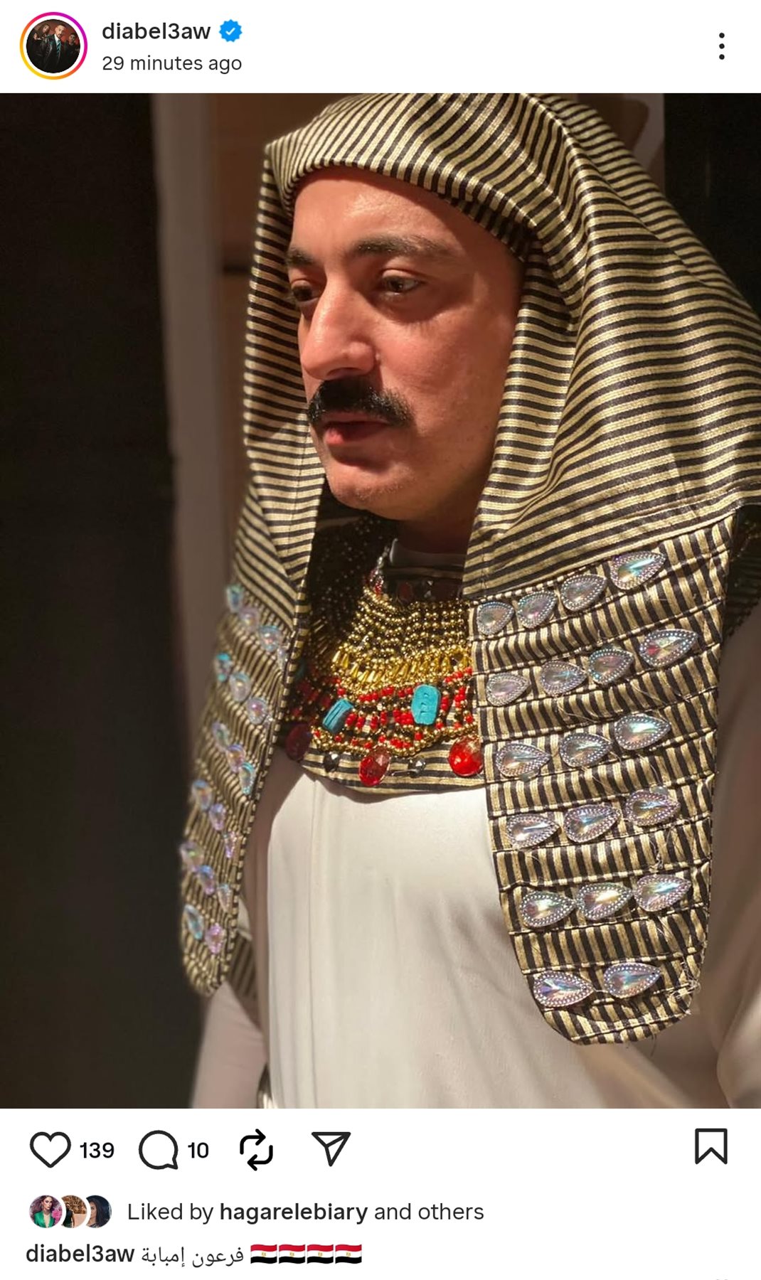 ونشر دياب صورة له بالزي الفرعوني، وذلك من خلال حسابه الرسمي عبر موقع تبادل الصور والفيديوهات القصيرة إنستجرام، وكتب: فرعون إمبابة.