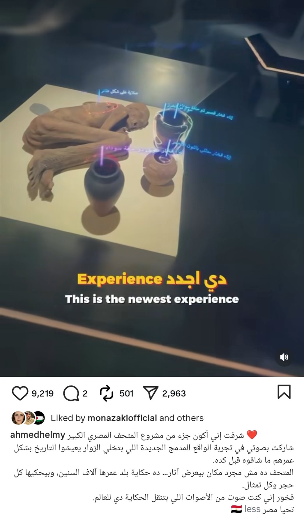 أضاف: شاركت بصوتي في تجربة الواقع المدمج الجديدة اللي بتخلي الزوار يعيشوا التاريخ بشكل عمرهم ما شافوه قبل كده.