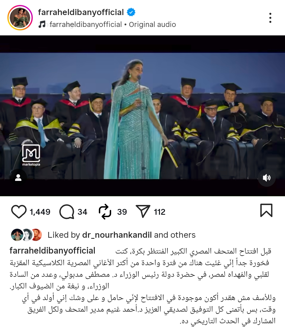 وشاركت فرح الديباني جمهورها مقطع فيديو أثناء غنائها أغنية يا أحلى اسم في الوجود، من خلال حسابها الرسمي عبر موقع تبادل الصور والفيديوهات القصيرة إنستجرام، وكتبت: قبل افتتاح المتحف المصري الكبير المنتظر بكرة، كنت فخورة جداً إني غنيت هناك من فترة واحدة من أكثر الأغاني المصرية الكلاسيكية المقربة لقلبي والمهداه لمصر في حضرة دولة رئيس الوزراء د. مصطفى مدبولي، وعدد من السادة الوزراء، ونبغة من الضيوف الكبار.