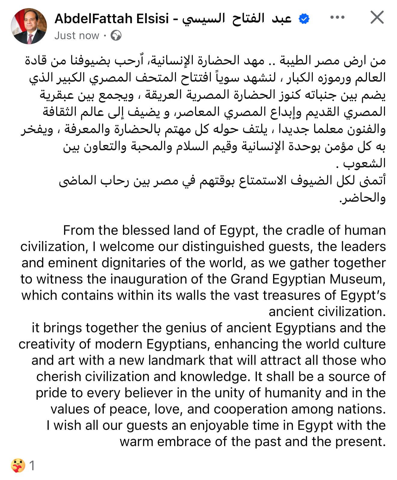 وقال الرئيس السيسي عبر صفحته الشخصية: من ارض مصر الطيبة، أرحب بضيوفنا من قادة العالم ورموزه الكبار، لنشهد سوياً افتتاح المتحف المصري الكبير الذي يضم بين جنباته كنوز الحضارة المصرية العريقة ، ويجمع بين عبقرية المصري القديم وإبداع المصري المعاصر، ويضيف إلى عالم الثقافة والفنون معلما جديدا، يلتف حوله كل مهتم بالحضارة والمعرفة، ويفخر به کل مؤمن بوحدة الإنسانية وقيم السلام والمحبة والتعاون بين الشعوب، متمنياً لكل الضيوف الاستمتاع بوقتهم في مصر بين رحاب الماضي والحاضر.