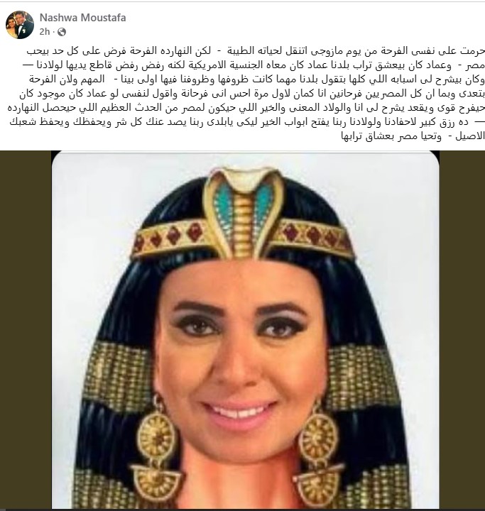 وكتبت نشوى مصطفى من خلال حسابها الرسمي عبر موقع التواصل الاجتماعي فيسبوك، قالت: حرمت على نفسى الفرحة من يوم مازوجى اتنقل لحياته الطيبة- لكن النهارده الفرحة فرض على كل حد بيحب مصر- وعماد كان بيعشق تراب بلدنا عماد كان معاه الجنسية الامريكية لكنه رفض رفض قاطع يديها لولادنا وكان بيشرح لى اسبابه اللي كلها بتقول بلدنا مهما كانت ظروفها وظروفنا فيها اولى بينا.