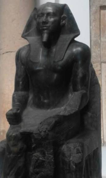 تمثال رائع مصنوع من حجر الديوريت الصلب، ويوجد حالياً في المتحف المصري بالتحرير. يظهر الملك جالساً على عرشه، وتحتضنه حورس (الصقر) من الخلف، مما يدل على الحماية الإلهية للملك. يتميز بالجمال والدقة ونعومة الملمس رغم صلابة الحجر المستخدم.
