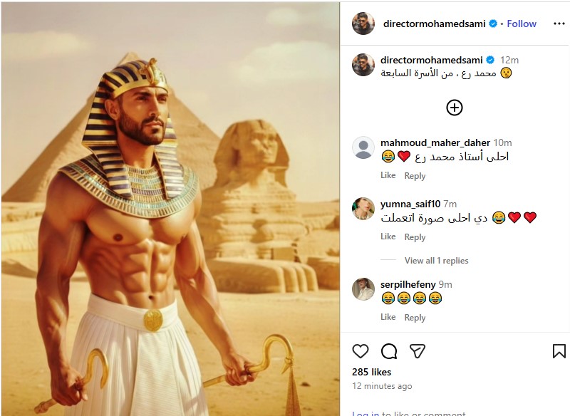 ونشر محمد سامي صورة بالزي الفرعوني، من خلال حسابه الرسمي عبر موقع تبادل الصور والفيديوهات القصيرة إنستجرام وكتب:محمد رع من الأسرة السابعة.