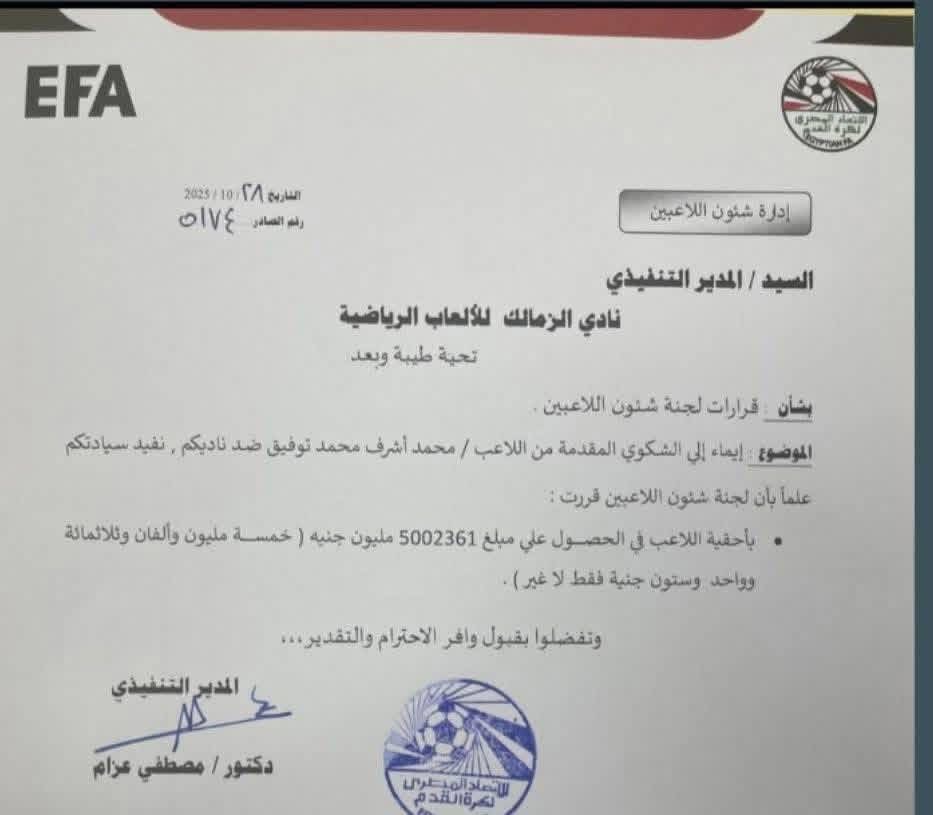 ألزمت لجنة شؤون اللاعبين بالاتحاد المصري لكرة القدم نادي الزمالك بسداد مبلغ 5 ملايين جنيه لصالح لاعبه السابق محمد أشرف روقا، بعد نظر الشكوى التي تقدّم بها للحصول على مستحقاته المالية المتأخرة.