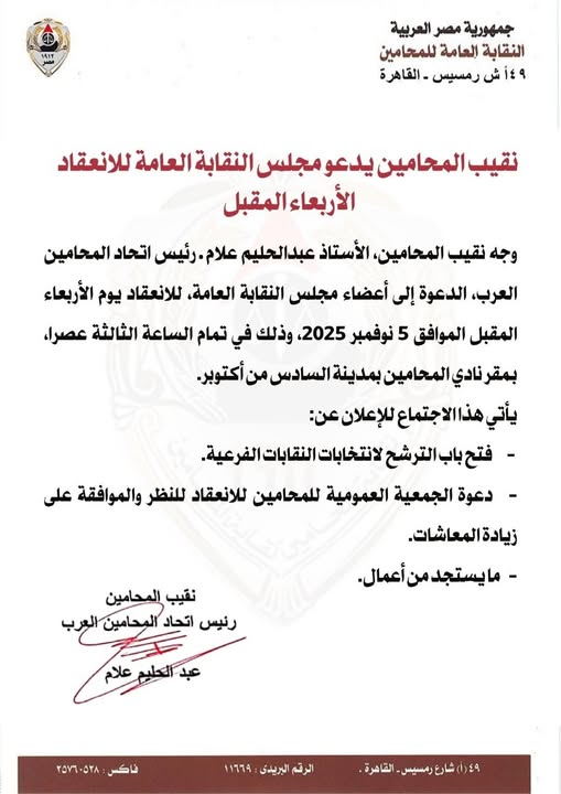 وجه نقيب المحامين، عبدالحليم علام ـ رئيس اتحاد المحامين العرب، الدعوة إلى أعضاء مجلس النقابة العامة، للانعقاد يوم الأربعاء المقبل الموافق 5 نوفمبر 2025، وذلك في تمام الساعة الثالثة عصرا، بـمقر نادي المحامين بمدينة السادس من أكتوبر.
