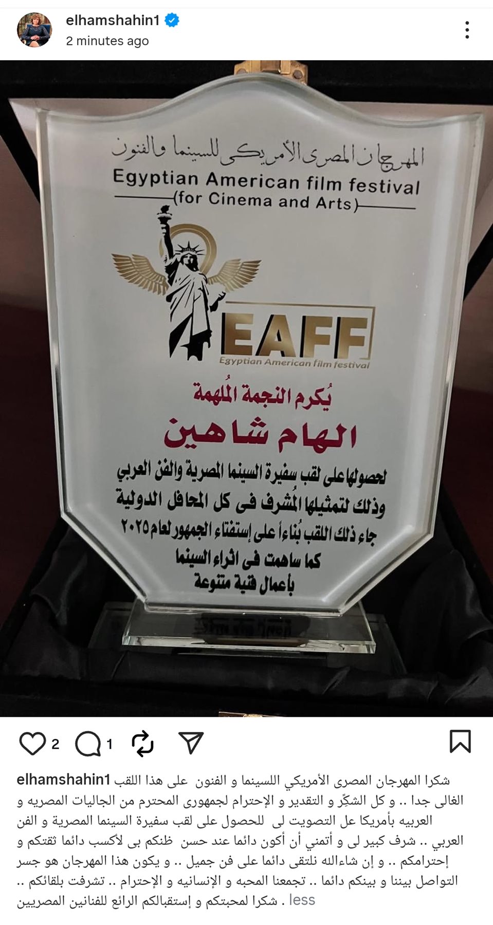 ووجهت إلهام شاهين رسالة شكر عبر حسابها الرسمي بموقع تبادل الصور والفيديوهات القصيرة إنستجرام، قالت: شكرا للمهرجان المصري الأمريكي للسينما والفنون على هذا اللقب الغالي جدا، وكل الشكر والتقدير والاحترام للجمهور المحترم من الجاليات المصرية والعربية بأمريكا على التصويت لي للحصول على هذا اللقب.
