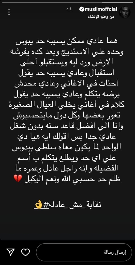 وكتب مسلم من خلال حسابه الرسمي عبر موقع تبادل الصور والفيديوهات القصيرة إنستجرام، قال: هما عادي ممكن يسيبه حد يبوس وحده علي الاستديج وبعد كده يفرشه الارض ورد ليه ويستقبلو أحلى استقبال وعادي يسيبه حد يقول أحئات في الاغاني وعادي محدش برضه يتكلم وعادي يسيبه حد يقول كلام في أغاني يخلي العيال الصغيرة تعور بعضها وكل دول ما يتحسبوش وانا الي افضل قاعد سنه بدون شغل عادي جدا بس اقولك ايه هيا دي الواحد لما يكون معاه سلطي بيدوس علي اي حد ويطلع يتكلم ب أسم الفضيله وإنه راجل عادل وعمره ما ظلم حد حسبي الله ونعم الوكيل ؟؟.. نقابة مش عادله.