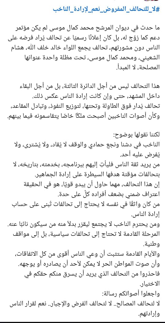 وقال البيان: "لا لتحالف المصالح.. لا لتحالف الفرض والإجبار.. نعم لقرار الناس وإرادتهم، صوتك أمانة، لا تسلمه إلا لمن يستحقها".