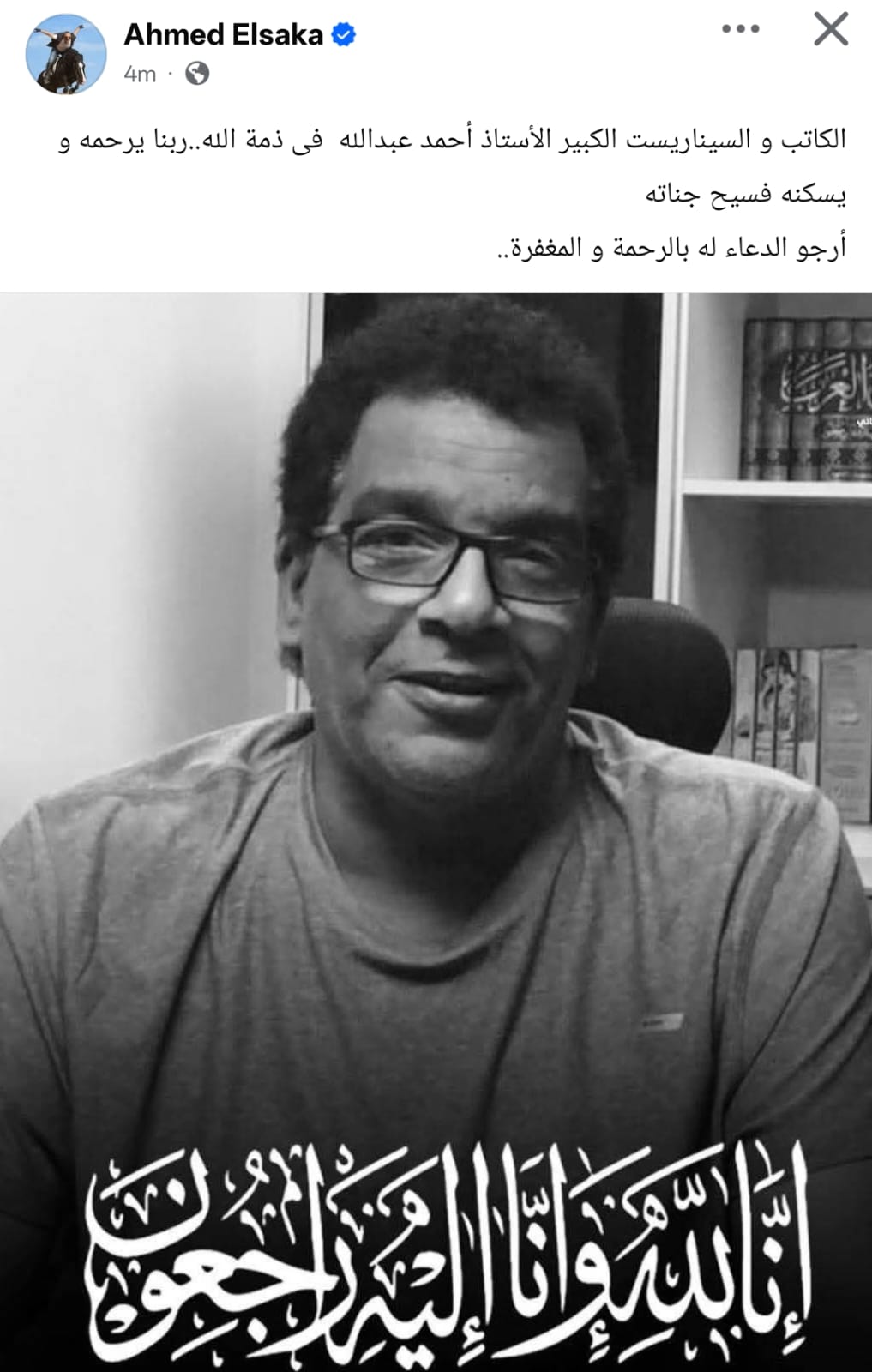 ونشر أحمد السقا صورة المؤلف أحمد عبد الله، من خلال حسابه الرسمي عبر موقع التواصل الاجتماعي فيسبوك، وكتب: الكاتب والسيناريست الكبير أحمد عبد الله في ذمة الله.. ربنا يرحمه ويسكنه فسيح جناته.. أرجو الدعاء له بالرحمة والمغفرة.